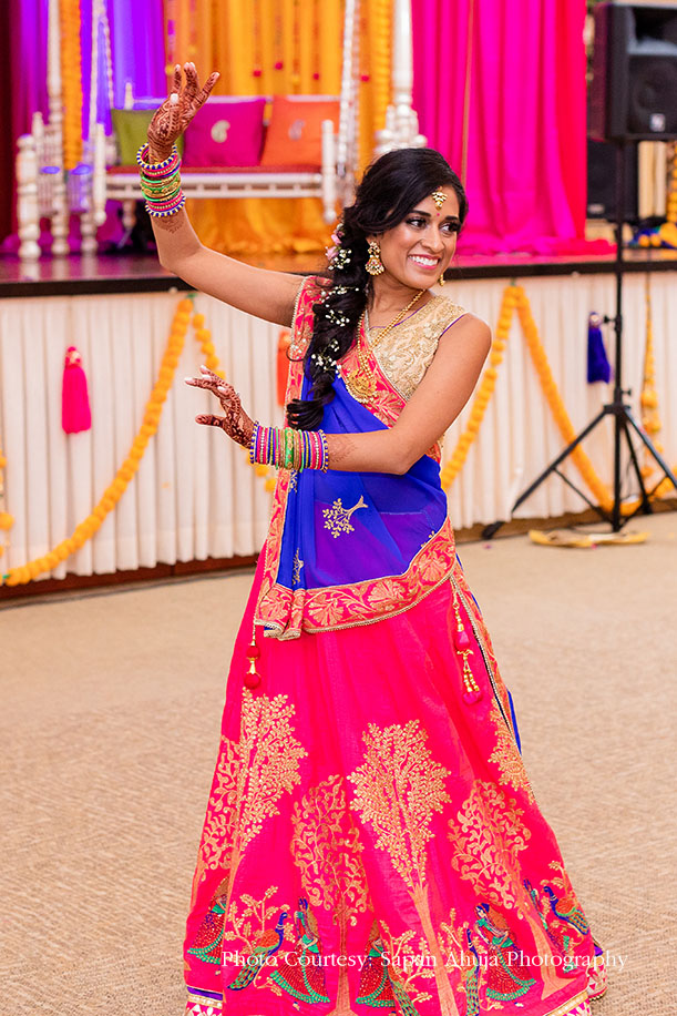 “Bright hues such as royal blue, hot pink, yellow, orange, green and more came together to deck up the venue for the garba night. We had golden birdcages and tree structures as our centerpieces. I wore a pink lehenga with a golden blouse and a blue dupatta while Harsh opted for a red outfit.”