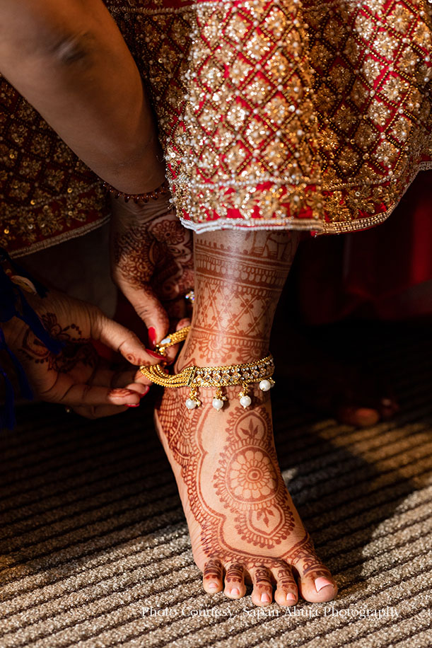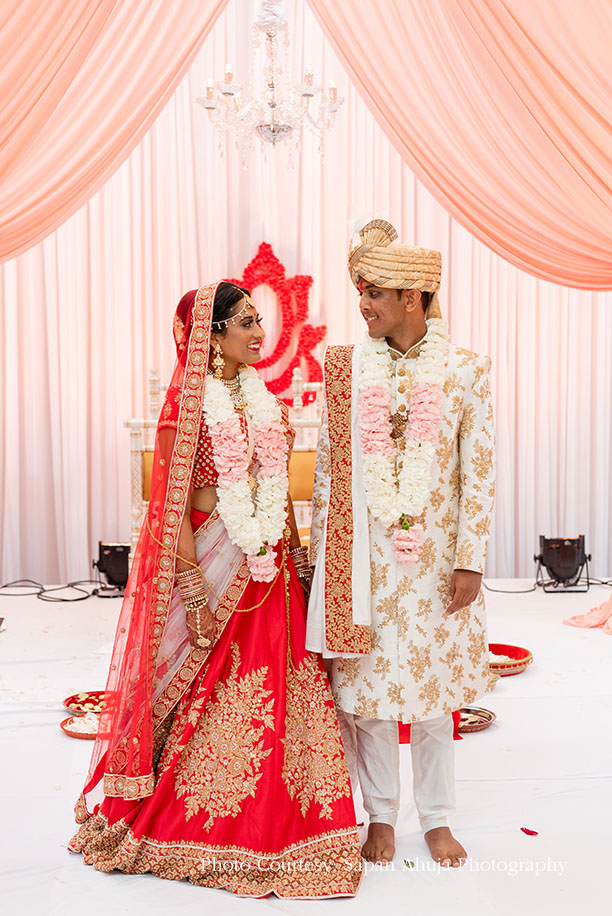 “I was going for a very traditional Indian bridal look for my wedding and found the perfect red lehenga in Baroda. It was unique and totally my style. I chose to wear my hair in a similar style to my mom on her wedding day. We designed Harsh’s outfit to complement the work on my outfit with accents of red in his dupatta paired with traditional temple jewellery.