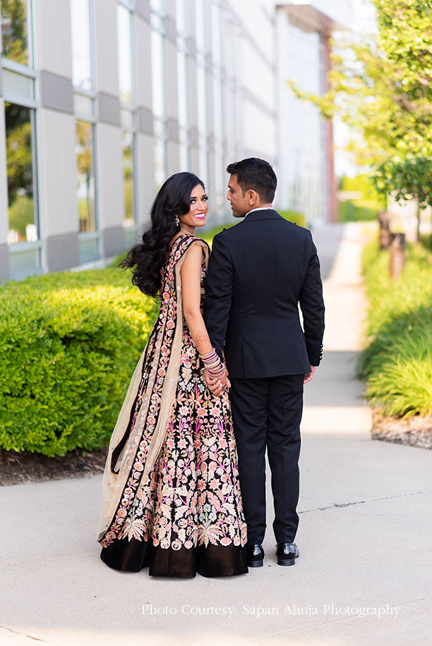 “My reception outfit again was very unique and was covered in hand embroidery. It had a lot of detailing and the muted shades used against the black fabric were stunning. Harsh wore a custom classic black tux. The decor was simple yet very elegant and the colors used matched those in my outfit.”