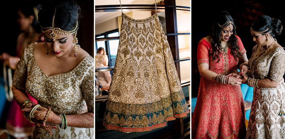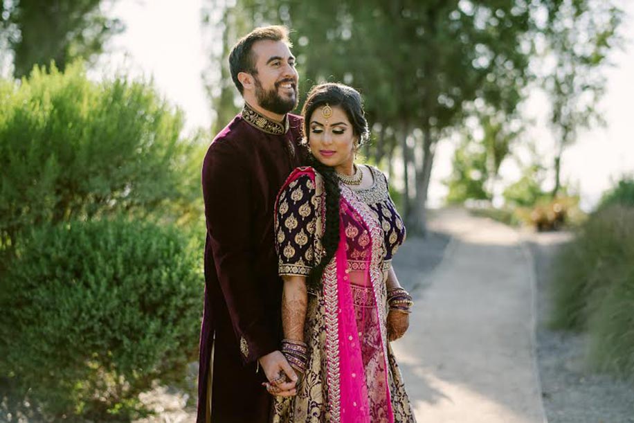 “Although we come from different cultures, we had a traditional Gujarati wedding at the Anaheim Marriott hotel in sunny California in the middle of June. The wedding was held indoors in the Grand Ballroom, with a gorgeous mahal-like mandap adorned with beautiful gold and red drapery. The décor had a royal theme with large pillars, palace doors, and deep red and white florals. There was a traditional baraat ceremony – Steve arrived in a classic Rolls Royce Corniche, while the baraatis danced happily to Bollywood songs remixed with American songs. I wore a stunning custom-designed lengha by Jiya By Veer Design Studio. I wanted to incorporate both of our cultures in our wedding outfit – so the team at the design studio helped me design a gorgeous two-piece ivory lehenga with a touch of emerald green and deep red. It was paired with a white dupatta that was resplendent with a thick green border with beautiful embroidery. It was by far the most beautiful dress I had ever seen. I felt like a royal princess, waiting to meet her handsome prince. I was adorned from head-to-toe with beautiful Rajasthani kundan jewellery from Sajni in Mumbai. Steve also wore a custom-designed sherwani by Jiya By Veer Design Studio, with matching custom ‘juttis’ (ethnic shoes) and a fan-style ‘safa’ (turban) in elegant self-embroidered fabric and a black band in the front.”
