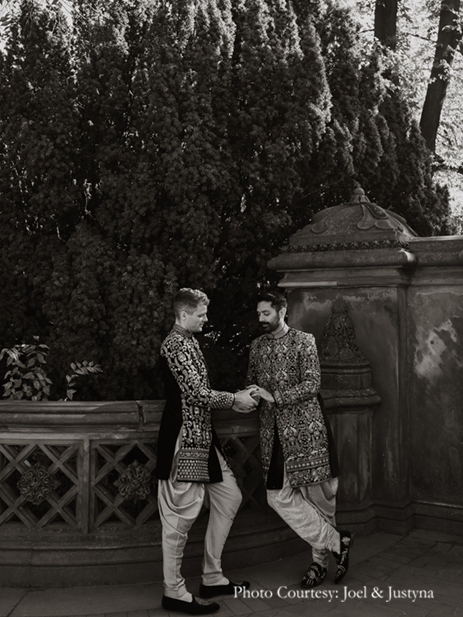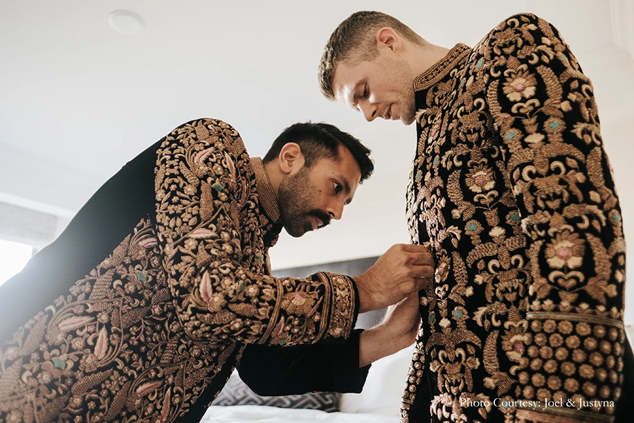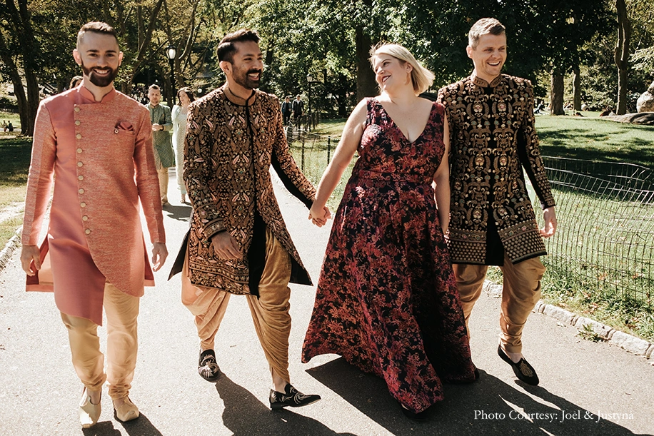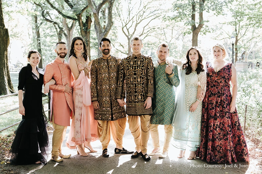 A warm mix of Indian and western traditions, the ceremony was hosted on a picture perfect fall day in 2019. Rishi and Dan were resplendent in bespoke black sherwanis embroidered with intricate gold work and pops of aqua and pink, which they teamed with embroidered footwear, all lovingly designed and made by Rishi’s family in India. They also wanted their wedding party to really experience the joy of wearing Indian clothes, and they gifted them all coordinating outfits as well.