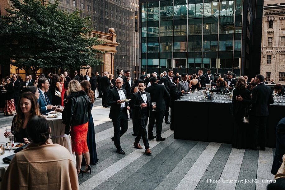 They walked down the aisle together to a cover of Tina Turner’s “Simply the Best” as sung by Noah Reid in the award-winning series Schitt’s Creek. The ceremony began with a Hindu prayer by Rishi’s grandmother, and was officiated by two of their closest friends. The nuptials were followed by a cocktail hour on the Weill Terrace of Carnegie Hall, which featured an open bar, a string quartet by Diverse Concert Artists, and Indian fusion hors d’oeuvres by caterers Bombay Talk.