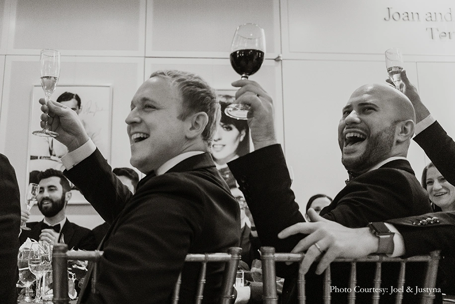 For the Reception dinner, the couple changed into custom tuxedos, and their guests wore black ties, which really tied into their aesthetic and venue. The buffet-style dinner was followed by tear-jerking speeches and emotional family moments in the adjoining ballroom, after which everyone danced the night away in the Weill Music Room.