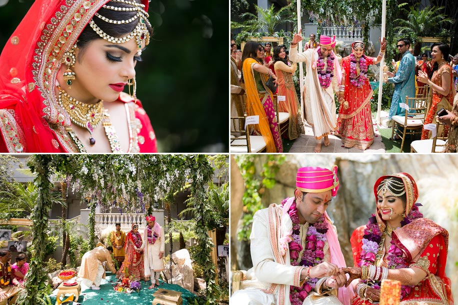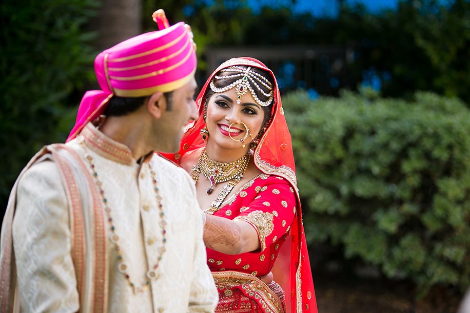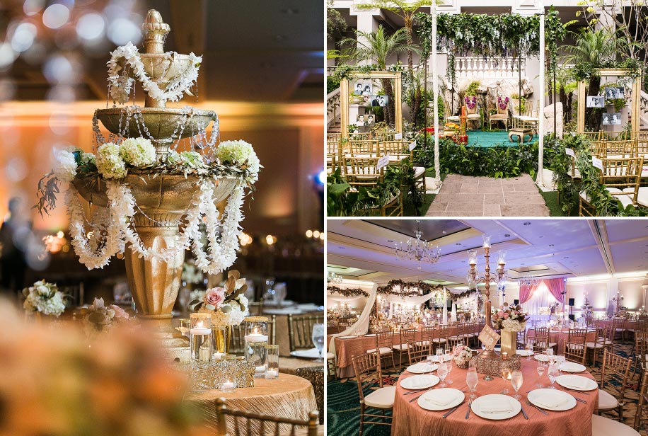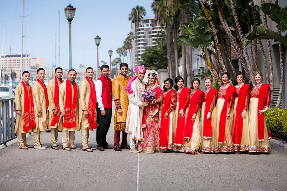 Runjhun shares, “We got married at the Ritz Carlton hotel in Marina Del Rey in California. We wanted to be as close to the water as possible, and this venue had the best of everything we wanted. The baraat area ran parallel to the marina, so Aditya’s guests came in dancing on the pier over the ocean that was lined with yachts. The ceremony site also had a balcony overlooking the mandap, which was vital for our dance sequence in the middle of our ceremony!” The couple not only wanted a stylish hotel, but also one that was conveniently located near an international airport as they had guests flying in from all across the world.