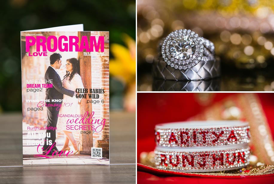 There were four functions in total – the Haldi-cum-Mehndi ceremony for Runjhun, Sangeet, Wedding and Reception. Runjhun and Aditya are big fans of all things Bollywood. The programme brochure, designed by the bride, stating the times and venues of events was inspired by the Indian movie magazine Filmfare. The reception was styled like a movie premier! Guests had to walk on a red carpet to enter the venue which was ablaze under a lighted marquee with the name of the movie A Bollywood Affair, the ‘actors’– Aditya and Runjhun Parikh, and the ‘premiere’(read wedding) date. “Our guests had fun posing like movie stars and their short video interviews were turned into our guest book,” recollects Aditya.