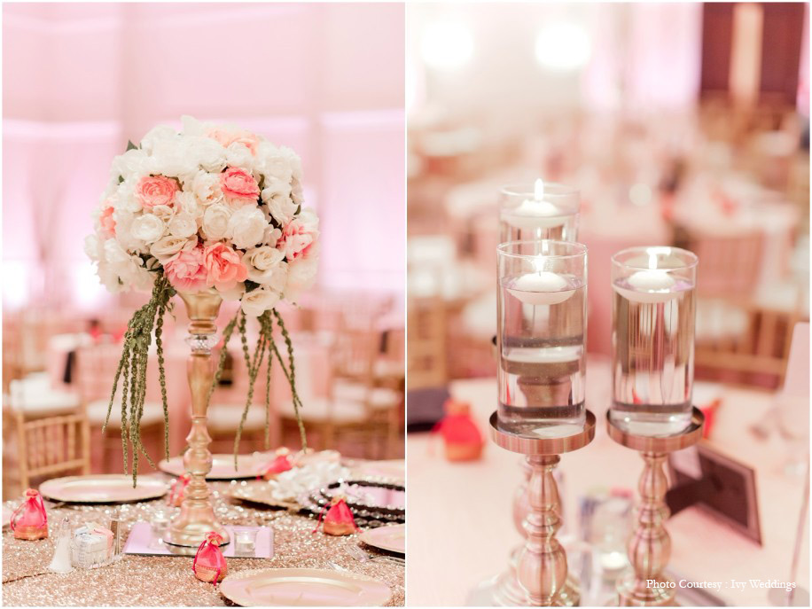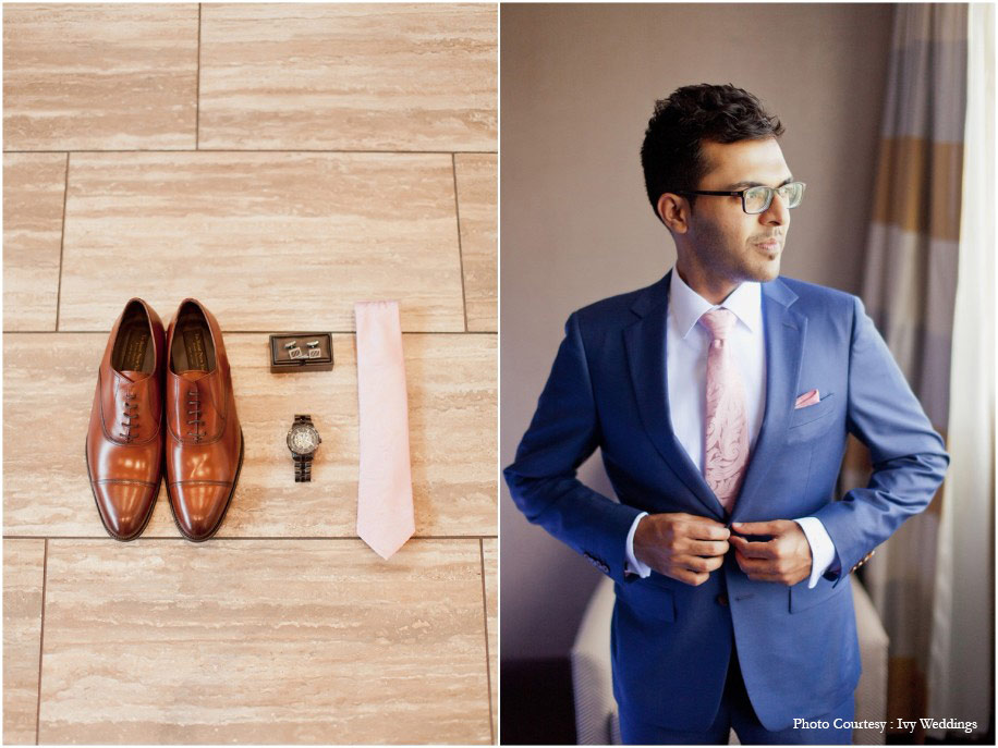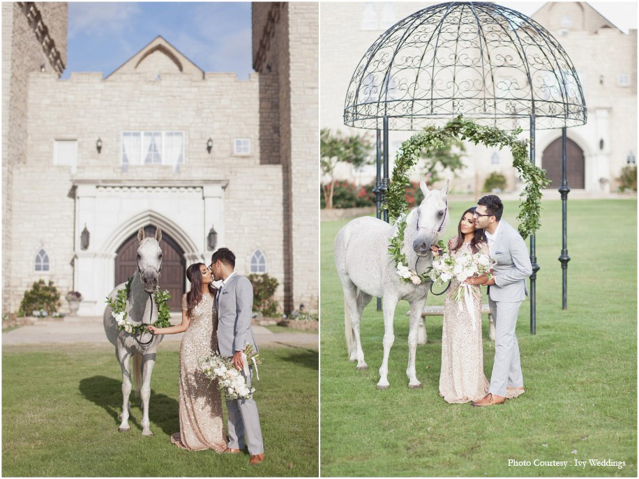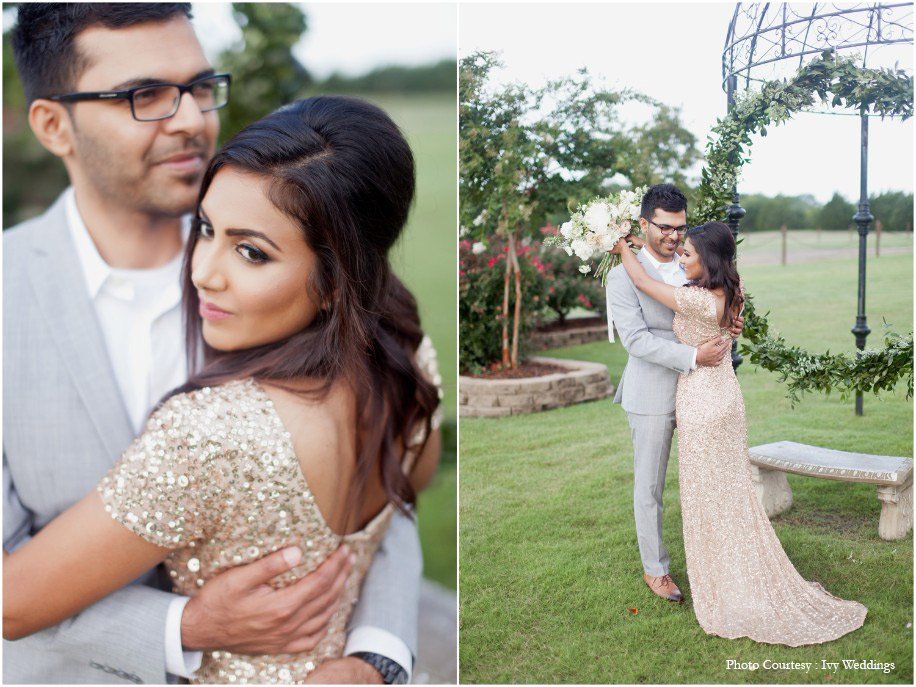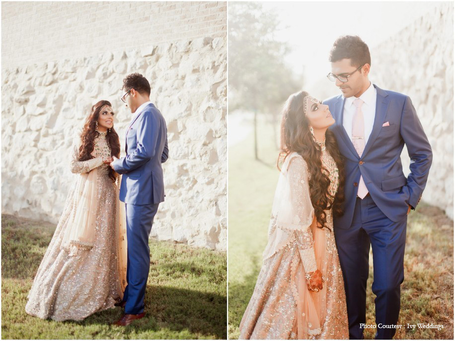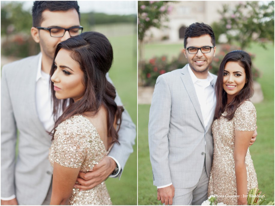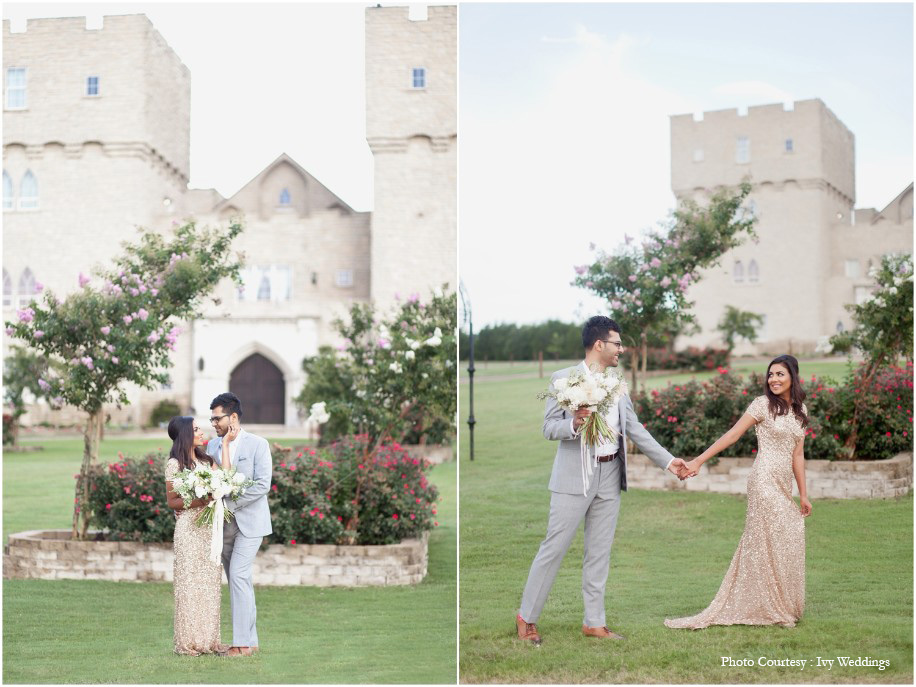 “While most couples plan their photoshoots together, ours was a romantic surprise! Saad had thought through everything, and it was done to perfection! A day before the wedding he took me to The Castle At Rockwall where both of us dressed our part while Ivy Weddings took care of the photography. I wore a beautiful sparkly gown by Adrienne Papell, and Saad opted for a grey suit by Bar III which he accessorized with a Kenneth Cole watch. My makeup was taken care of by Sadia Sanam, and Expressions of Decor helped us with the floral arrangements.”