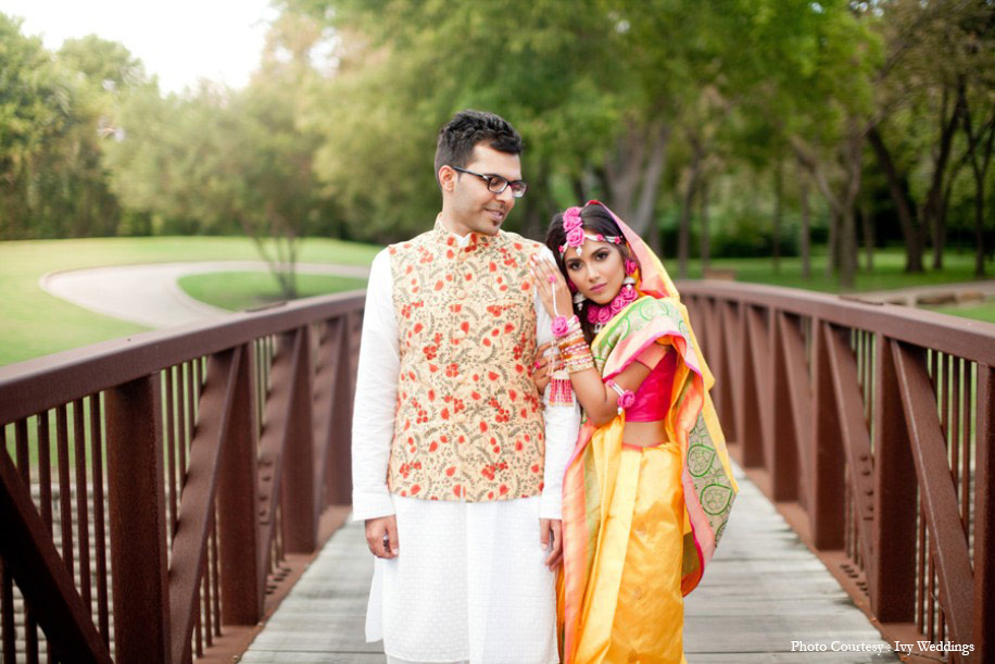 A traditional ceremony was hosted by the bride’s family known as the ‘gaye holud’ in Bengali or ‘haldi’ in Hindi. “This involved our family and friends applying generous amounts of turmeric paste on Saad and me. This was followed by our friends engaging in a proxy war through choreographed dance performances (think: Bollywood dance off). The ceremony, held at The Texas Star, was a combination of colors and sound. I had envisioned my haldi function to be very loud, vibrant and filled with love and that’s just what we managed to achieve. A lot of the decor elements, my clothes, jewellery, as well as the outfits for the bridal court were custom made from India and Bangladesh. I took a special trip to these places in December to hand-pick these things myself. The dress code for this function was traditional splendor. While I chose a bright yellow saree with a pink and green border from Vasabi Collection in Bangladesh, Saad opted for a white kurta and a yellow bandi jacket with a floral print.”