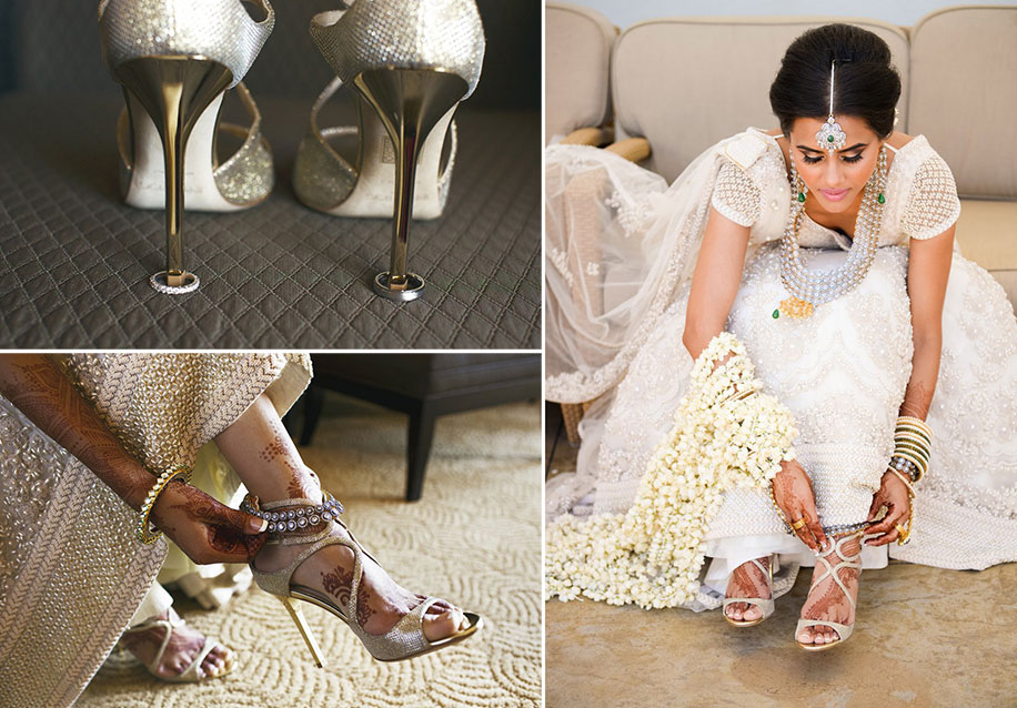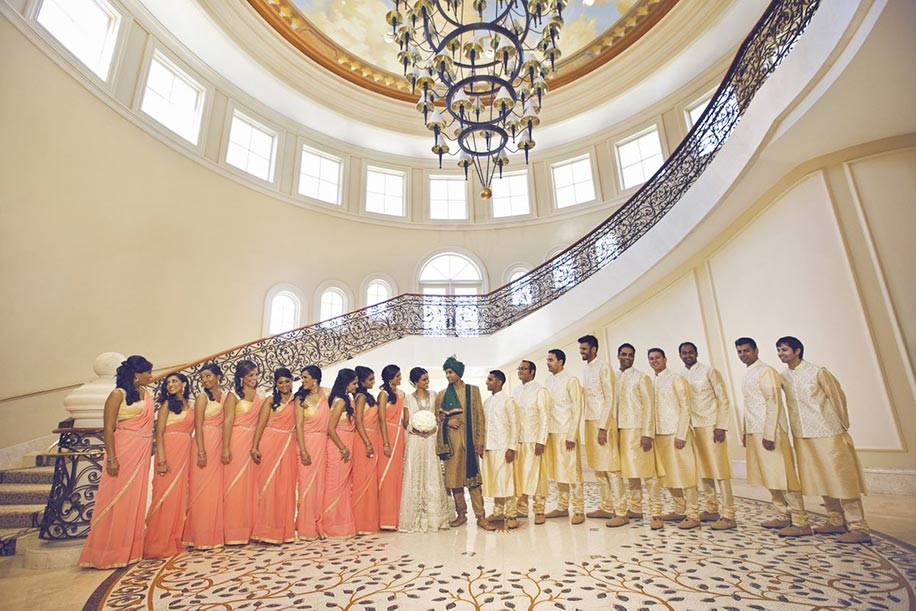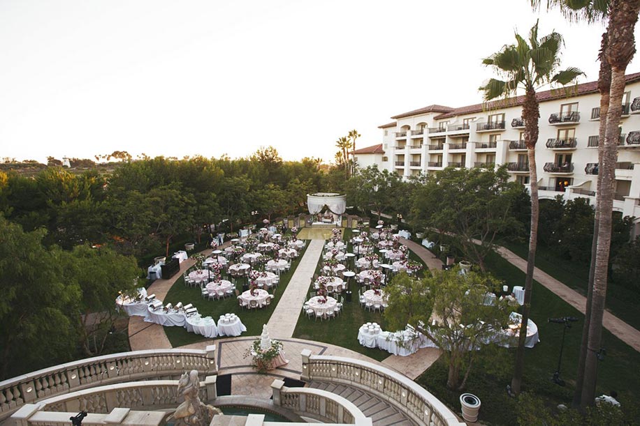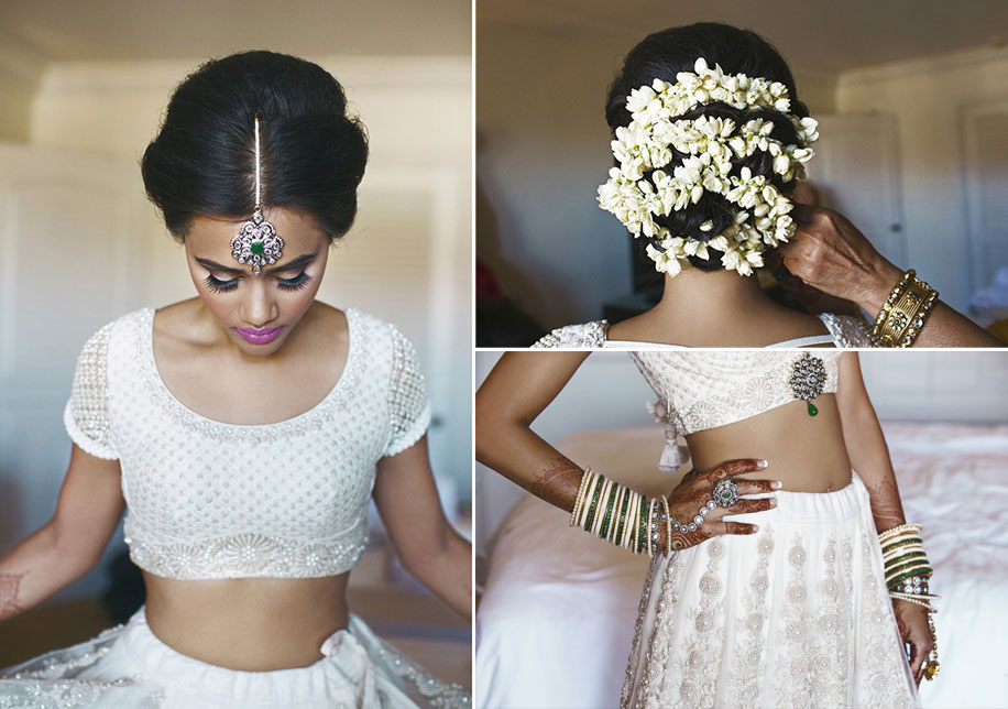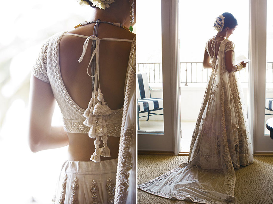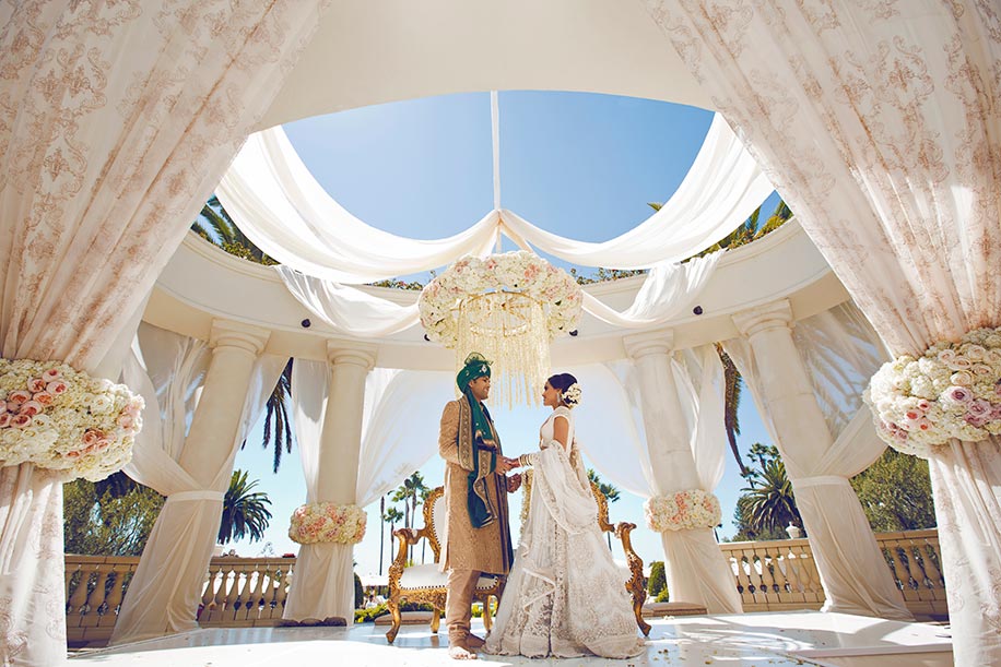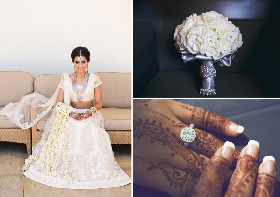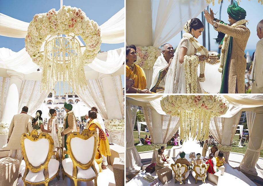 As a wedding planner, I know the mad frenzy that goes on behind a wedding! I wanted an outdoor beach wedding, with an amalgamation of modern classic and a dash of vintage. I have always associated Hindu weddings with color but wanted a simple yet elegant setup for my own wedding. Being familiar with all the area venues, and knowing our wedding would require five unique spaces, we zeroed in on The St. Regis Monarch Beach Resort at Dana Point, California. The morning ceremony was held outdoors with a rotunda draped in gauzy lace, wide floral tie-backs and a massive floral chandelier. The décor had an ivory theme with a pop of colorful flowers to offset the all-white decor. There was also a traditional baraat ceremony – Avi arrived on a horse, while the baraatis danced happily to the latest Bollywood tunes.