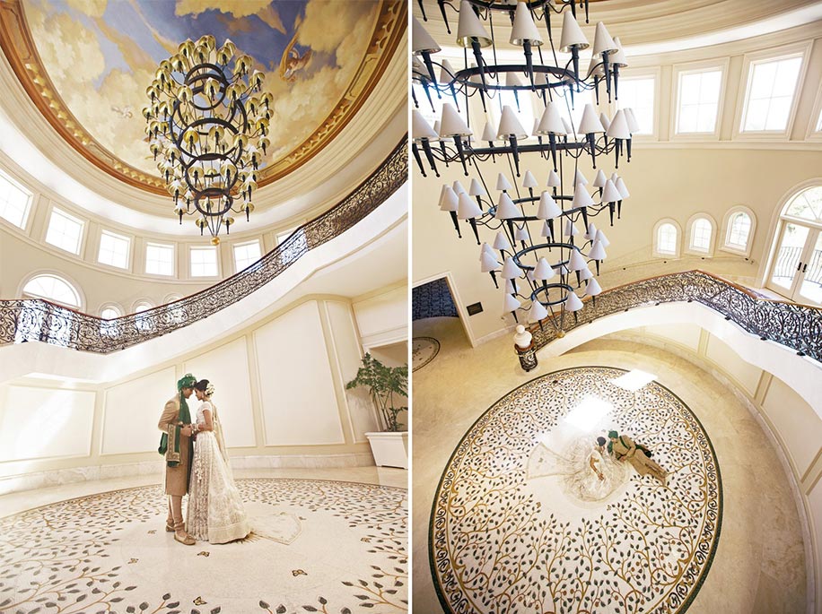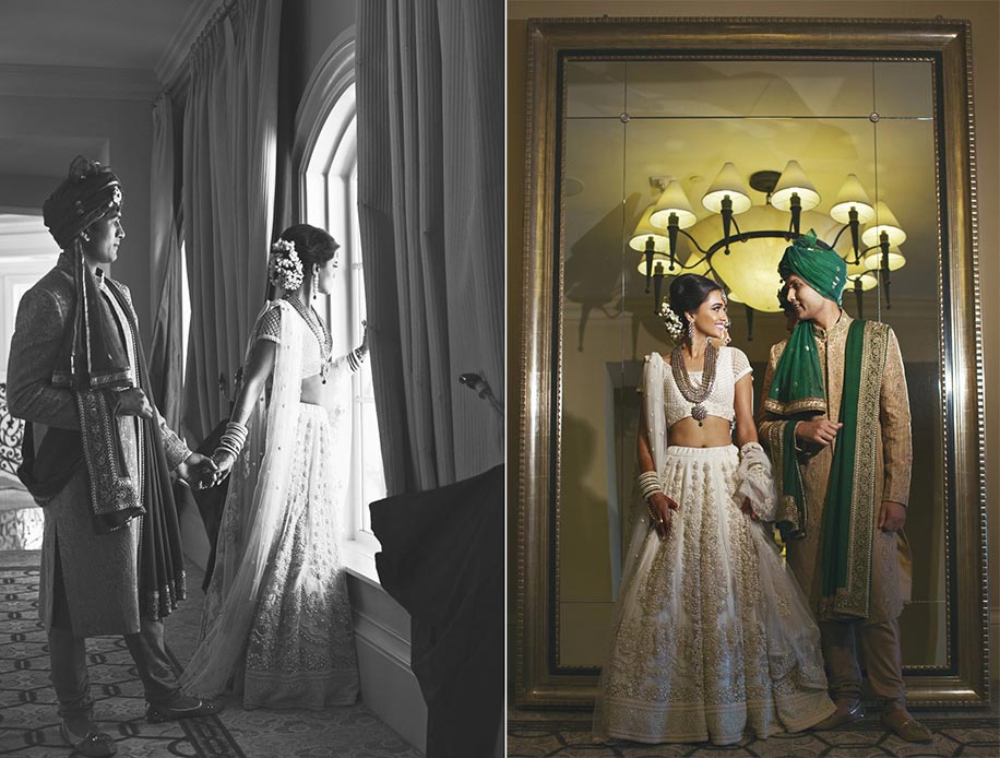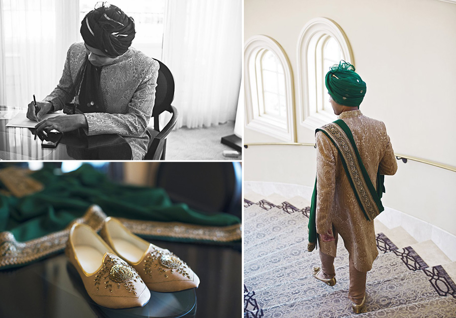 I wore a beautiful ivory lehenga by Sabyasachi Mukherjee. It is the most beautiful piece of clothing I have ever owned; the subtle embroidery made me feel like I was a princess, floating to my fairytale! I accessorized my hair with jasmine flowers, the traditional gajra and sported matching garlands of jasmine on my arm, to give it a very edgy look. Avi wore a green and gold sherwani for the wedding.