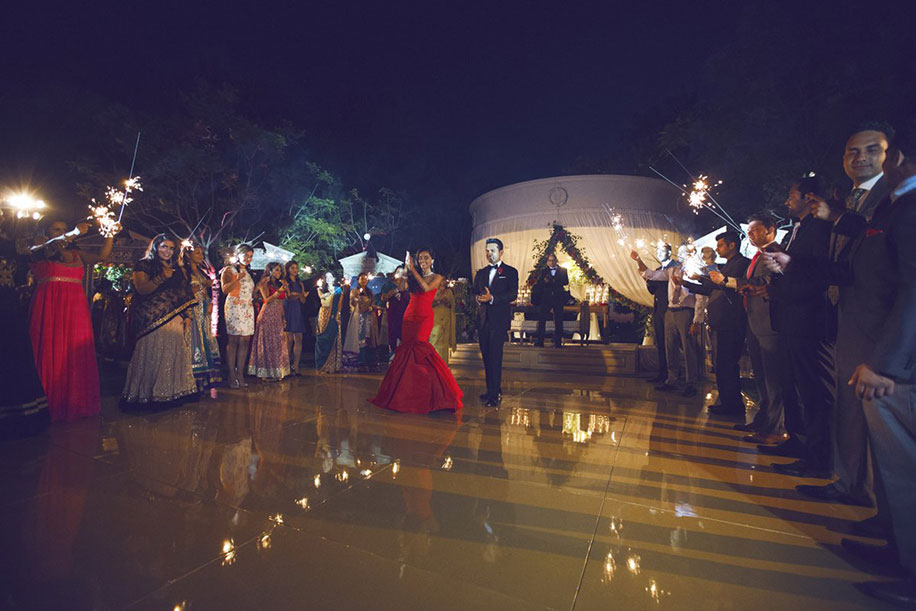 Our theme for the reception was the celebration of two cultures, ‘Two states, Two hearts and One happily ever after.’ I wanted my reception to be upbeat and full of jazz. We had professional dancers who performed for the guests with their acrobatic moves and swingy Bollywood dancing. Both Avi and I love to dance, so once they finished their performance, we jumped on the stage to shake a leg and shocked the guests by entertaining them with our dance moves. We even had mansion-sized mirrors on either side of the stage that reflected the sparkle of the evening in the beautiful decorated garden.