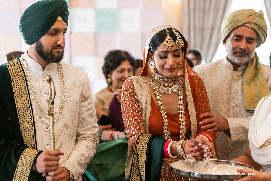 “Our ‘anand karaj’ had a very elegant feel to it, and we created the right mood using pastel hues. The open-air setting ensured that there was plenty of natural light, thus adding to the soothing ambiance. We also made it a point to have flowers from Venus ET Fleur at every event, and they made sure that each setup was unique and appealing. My rust colored lehenga was custom made by Anita Dongre herself who incorporated roses, a special tile design from the Golden Temple and a few evil eye motifs to ward off negativity in the design. Sunny wore an ivory Rohit Bal sherwani. His outfit featured floral designs and birds motifs, and Rohit Bal customized his collar by getting the same tile design from Golden Temple that was on my lehenga embroidered on it.”