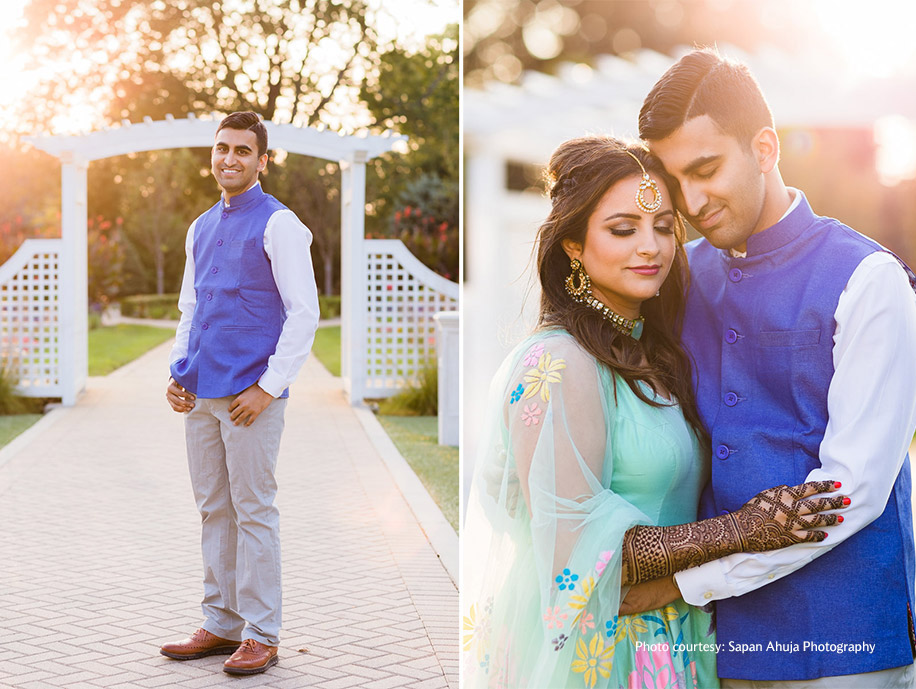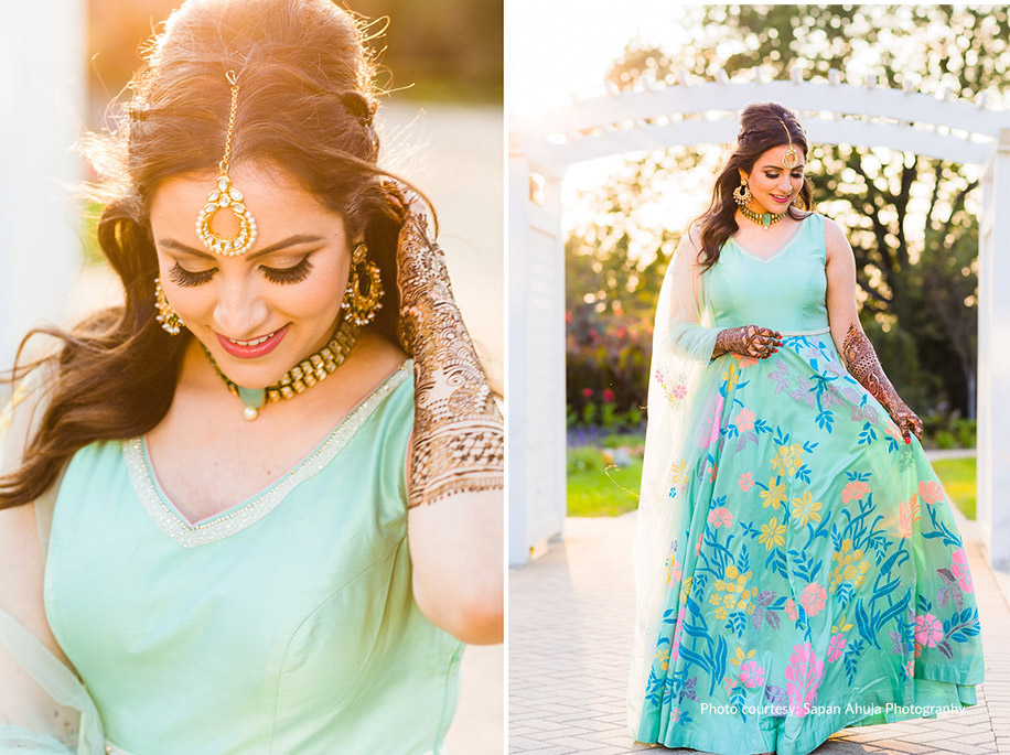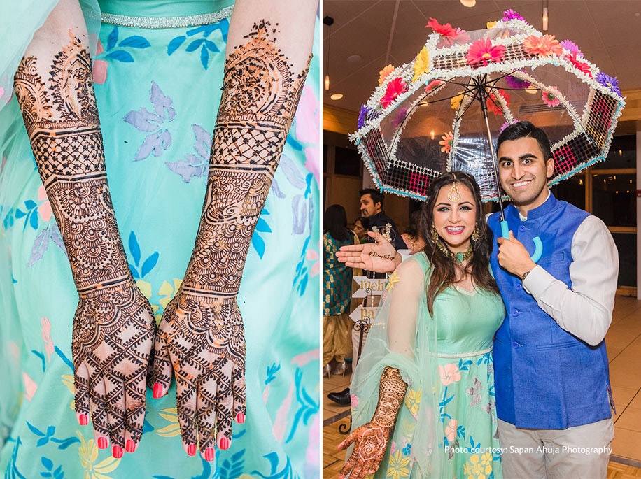 “Our mehndi was at a gorgeous historic facility, so we did not want to interfere much with the natural beauty of the place. Moreover, we had splurged on our wedding ceremony decor so we decided to make use of a lot of DIY decorations for this function. We incorporate flower umbrellas, menus, entry signs and photos to decorate the space. I wore an aquamarine anarkali from Benzer that feature floral patterns all over the skirt and the dupatta.”