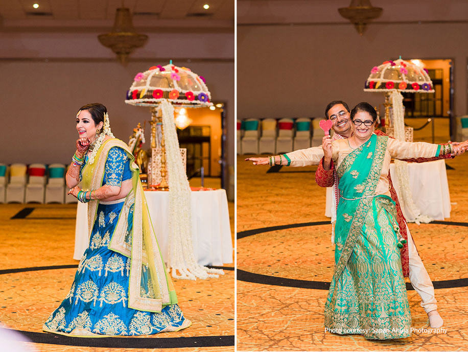 “We carried forward our DIY style decor from our mehndi and incorporated it at our sangeet as well. A blue lehenga with a yellow dupatta from Chamee and Palak was my outfit of choice for this event. Some of our closest family members performed at the function and the evening saw dances, songs and lots of ‘garba’ (traditional Gujarati dance)!”