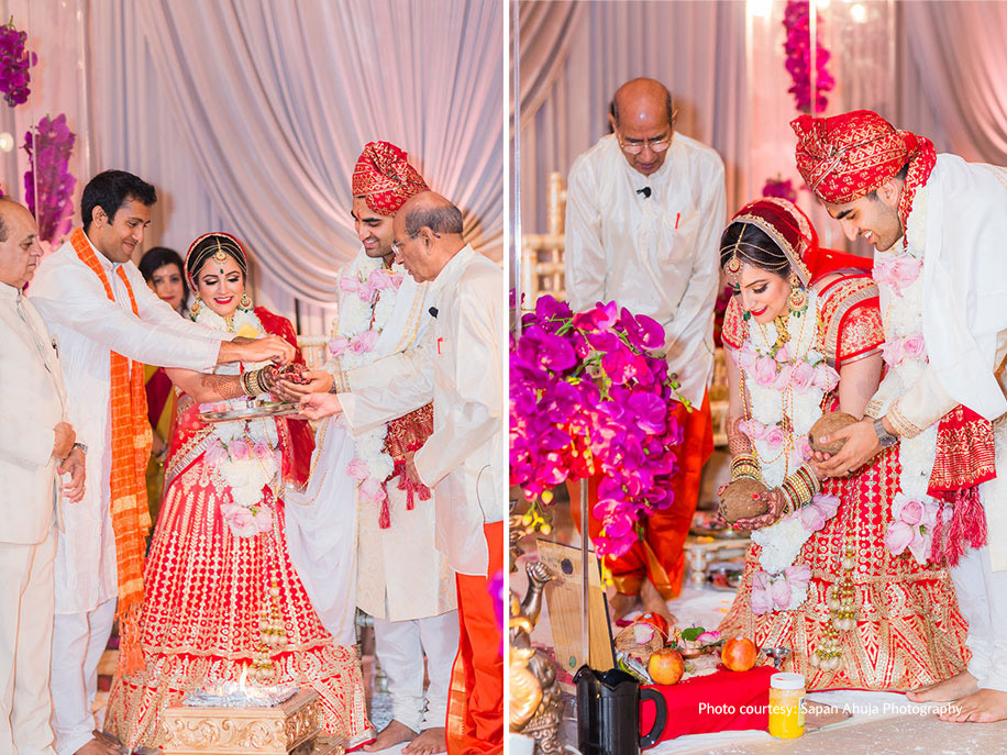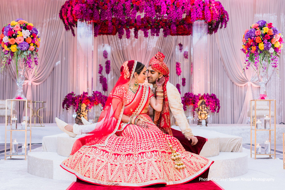“For the wedding, we wanted lots of flowers, candles, and bright colors. Sunset hues were what I had envisioned. I love pinks, oranges, and reds in designs as well as against my skin tone. Therefore, I even opted for a red lehenga which we bought from Benzer in Mumbai. I loved the way the design of our mandap was realized and I must say, Yanni Design Studio did an amazing job.”