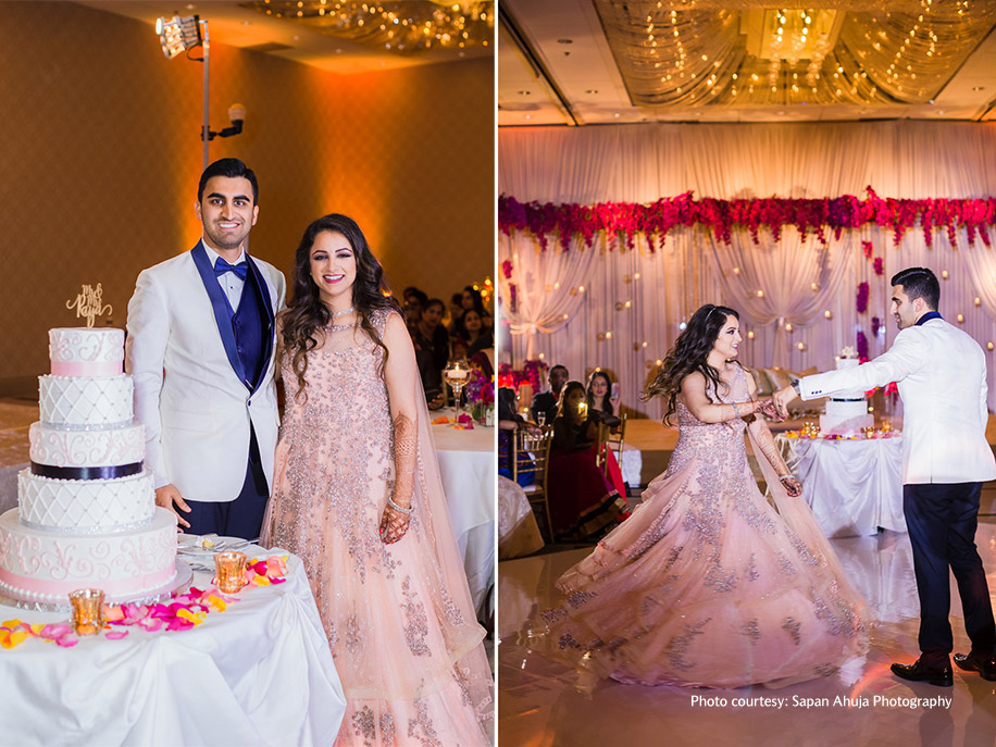 “The decor for our reception was elegant. The stage featured a backdrop of rippling drapes that were enhanced further by candles that were suspended at varying heights. Bunches of red flowers spilled from the ceiling and some clusters floated against the drapes. The set up was truly breathtaking. In terms of the outfits Nischal and I wore, we followed a pink and navy theme. I wore a gorgeous pastel gown by Dolly J while he wore a tuxedo with a navy lapel and navy trousers.”
