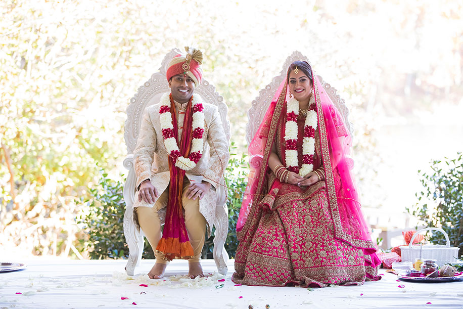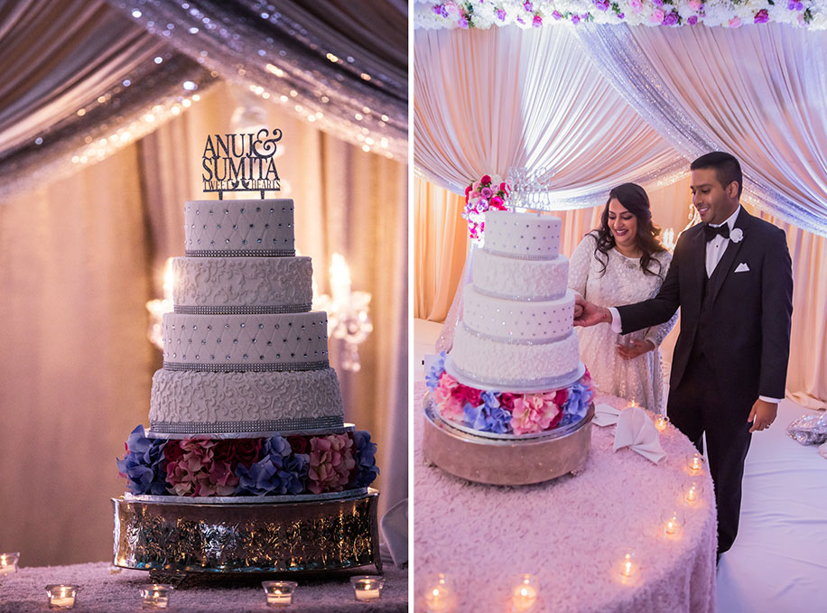 “The wedding ceremony was held outdoors, under a pavilion next to the brilliant blue waters. We opted for fresh flowers all around our mandap to bring out the beauty of our surroundings.” The mandap was festooned with champagne colored drapes around the four pillars and the canopy was surrounded by beautiful floral arrangements in pink, peaches and warm yellows. Sumita looked beautiful in a pink and gold lehenga from Radhika Boutique in Hyderabad with all over gold thread embroidery, while Anuj wore a traditional light cream sherwani with beige pajamas, and a pink and beige ‘safa‘ (turban).