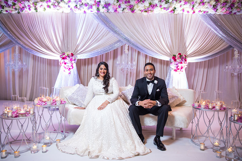 “The reception was a little more American in essence – we wanted an elegant yet exciting atmosphere, and our decorator did a great job in making that happen with lavender drapes in the background of the stage that was festooned with classy floral arrangements. My reception dress was a white, full-sleeved gown that was made from hand-picked material and was stitched by a local tailor in Hyderabad. Anuj’s tuxedo for the reception was from Polo Ralph Lauren.”