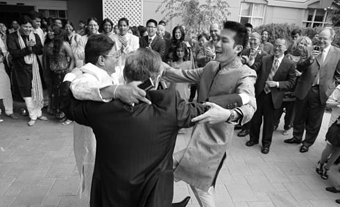 The beautiful wedding ceremony was attended by 400 guests and included both Indian and Chinese traditions. The Hindu ceremonies were conducted by Pandit Krishna Bhat Varanasi and Pandit Maruthi Bhagavatula. The decor was a fusion of deep reds, ambers, and a warm orange glow. Orchids and candles beautifully decorated the room.