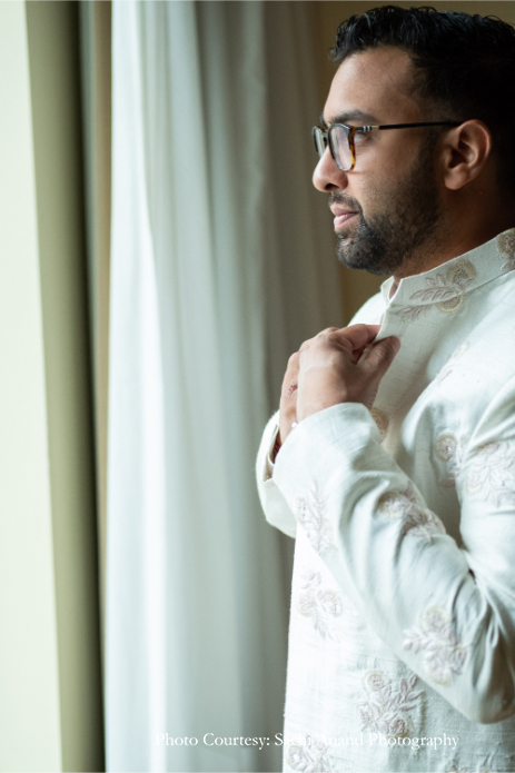 For the wedding I wanted a traditional look and Susmita was able bring that feel to my dark pink wedding lehenga that featured golden floral details with flair. Ketan’s ivory sherwani too exhibited beautiful floral embroidery and was paired with a beautiful light pink safa creating an exceptionally royal yet stylish look.