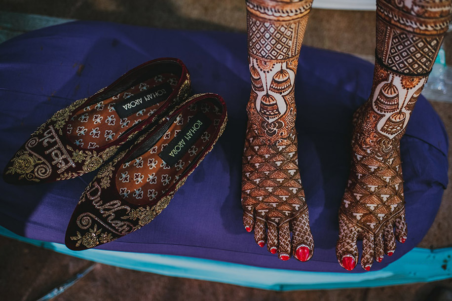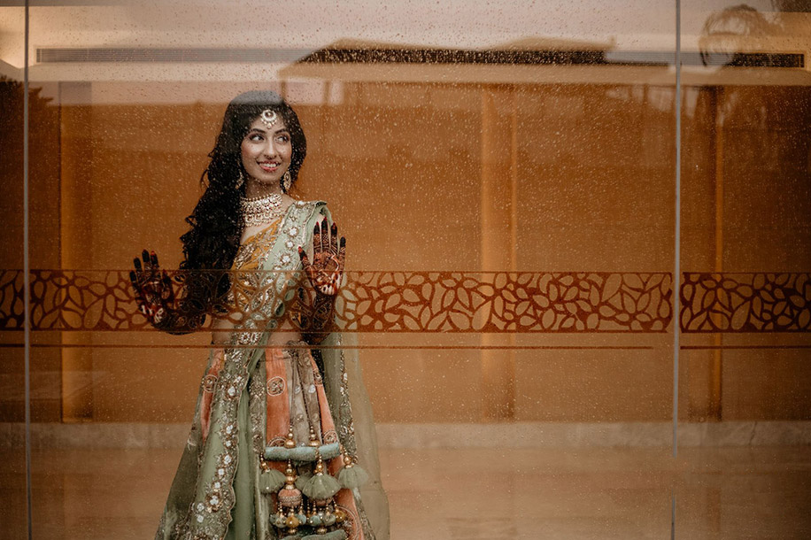 “For my mehndi, I always wanted to wear a multi-colored lehenga with a lot of ‘kalis’ (stripes), each of a different color. I found my dream outfit at Gazal Gupta in Delhi and customized it with velvet elements. The lehenga had huge ‘latkans‘ (tassels) that I customized with our names, and paired the outfit with ethnic shoes from Rohan Arora, that said ‘Pataka Dulhan.’ I wore Polki jewelry and kept my hair and makeup fresh and casual. The color palette of the function was largely Tiffany blue with a hint of floral elements. I walked in holding my dad’s hand to the song ‘Dilbaro!’ It was a very emotional experience.”