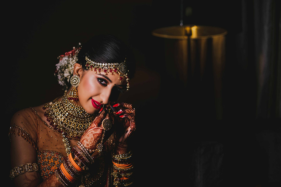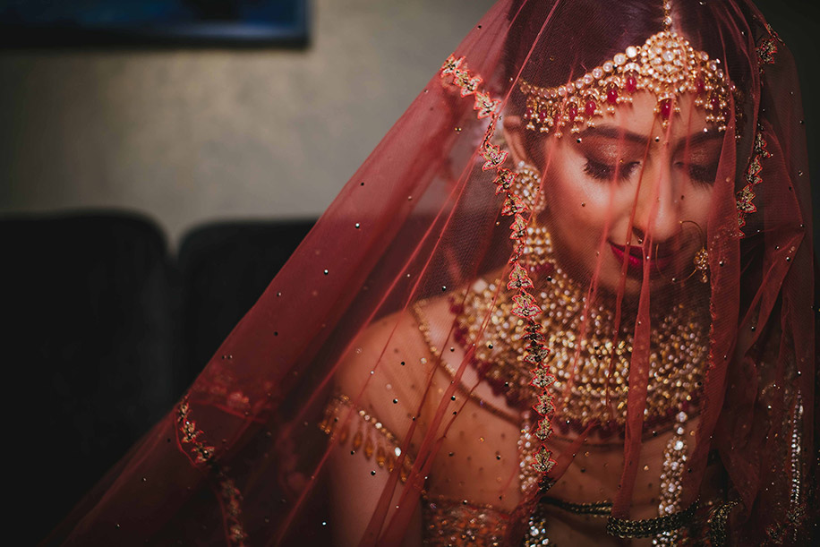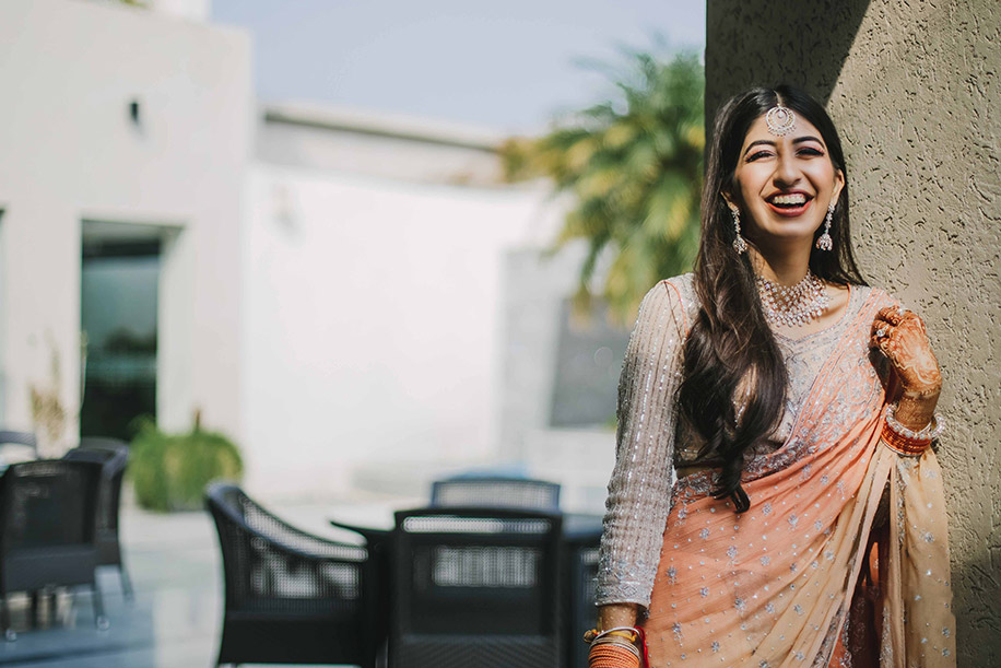 “I always loved Tarun Tahiliani’s work for its delicate and beautiful craftsmanship and knew my wedding lehenga had to be from him. I chose one in red and peach with intricate embellishments and paired it with an elaborate matha patti, layered necklaces, and long jhumkas. I even wore a ‘baju band’ (arm ornament), ‘haath phools’ on both hands, a lot of bangles and felt like a princess. Loveleen gave me beautiful dewy cheeks, shimmering eyes, and a bold red lip that complimented the color of my outfit.”