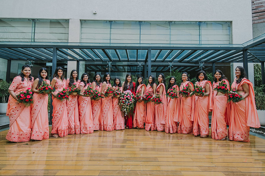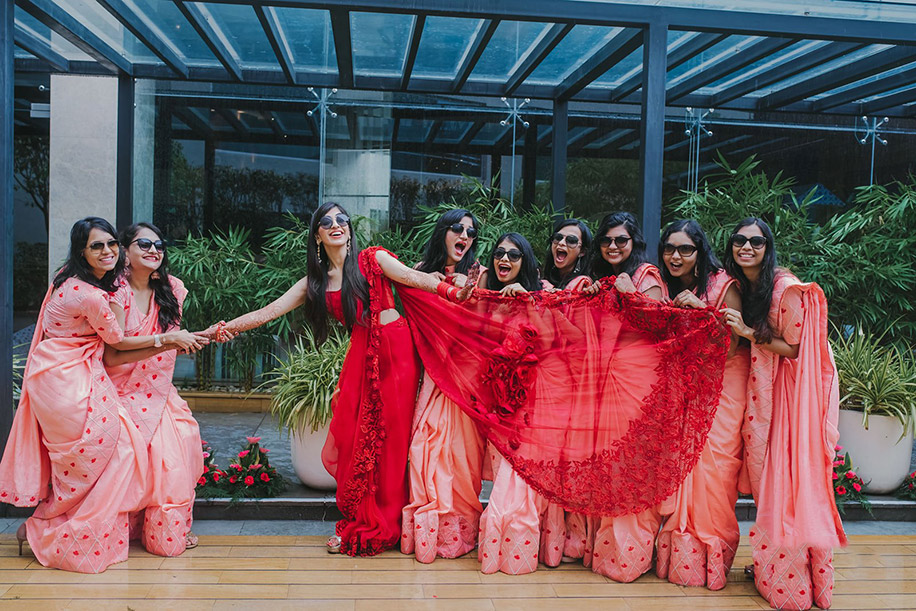 The happiness and excitement a girl feels when her bestie gets married is indescribable. Aayushi wanted to do something special for her squad and thoughtfully gifted all her friends’ outfits and bridesmaid hampers. On the wedding day, all of them dressed up in matching pink sarees and posed with the bride who wore red.