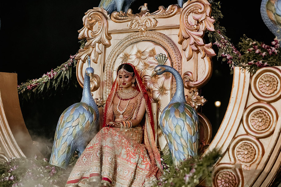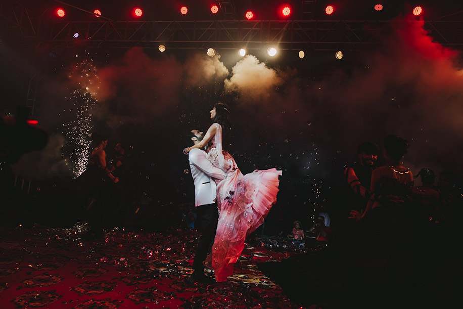 The functions kicked off with the engagement at The Leela Palace, New Delhi. The decor comprised grand ball-like decor with chandeliers, bouquets of roses, a dance floor, a life-size wedding hashtag, and soulful live music. The bride wore a beautiful red gown from Neeta Lulla, with diamond jewelry and a dazzling tiara.