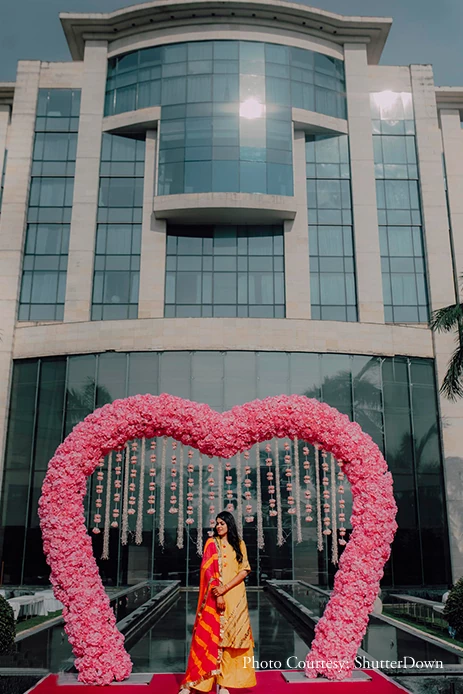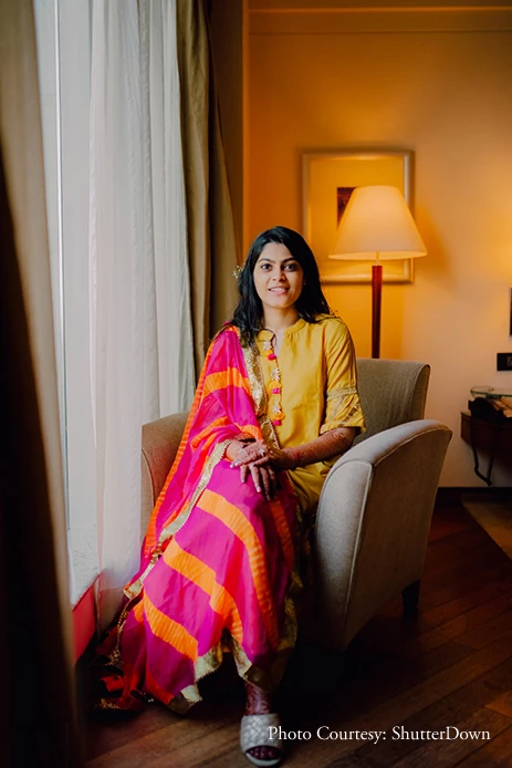 Keeping it comfy in a yellow sharara set, Darshika looked radiant as she enjoyed a playful haldi ceremony with her better half. For an added pop of color on her outfit, she chose a bright pink zari bordered dupatta that contrasted with the yellow hue of the kurta perfectly. She chose a toned-down makeup look, and instead accessorized her hair with delicate baby’s breath blooms.