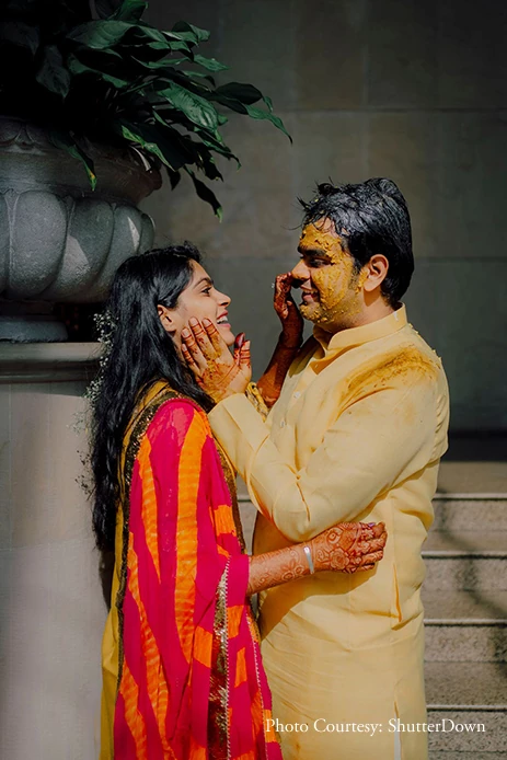 Our wedding was a two-day affair that included a bohemian-themed mehndi and a mirror-sparkle-themed tilak/sangeet ceremony on the first day. The next day, we conducted a haldi ceremony and a minimalistic wedding followed by a reception.