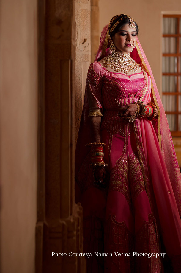 For the last and final wedding event, the bride stayed true to her personality and wore an outfit designed by her and her sister ensemble that included a stunning layered, textured and embellished lehenga in rose and fuchsia hues. Her jewellery included an exquisite polki set with a standout necklace and double-layered matha-patti. The pink flowers fixed in her hair enhanced her regal vibe.