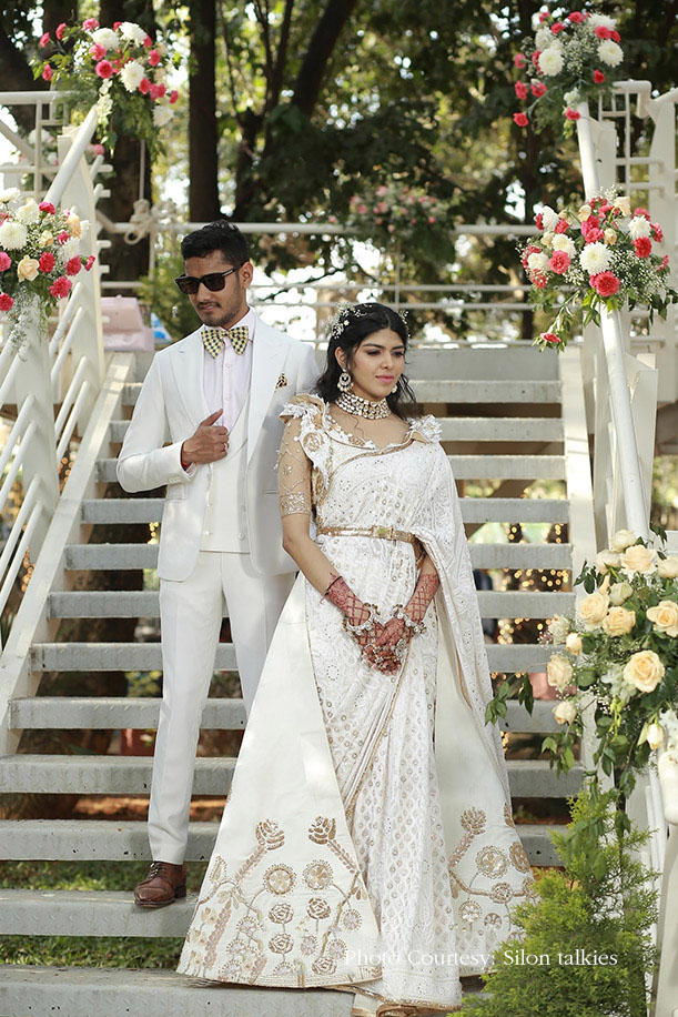 The woodsy, outdoor ring ceremony with a ‘Pocahontas’ theme saw romantic, bohemian decor which the bride perfectly embodied with her ivory flowing saree with chikankari work, designed by her label. Her ivory and gold blouse with textured work, embellishments and an embroidered cape bottom upped the glamor quotient by several notches. She teamed her attire with polki jewellery, a belt, demure pink makeup and open flowing locks with was adorned with sprigs of baby’s breath blooms.