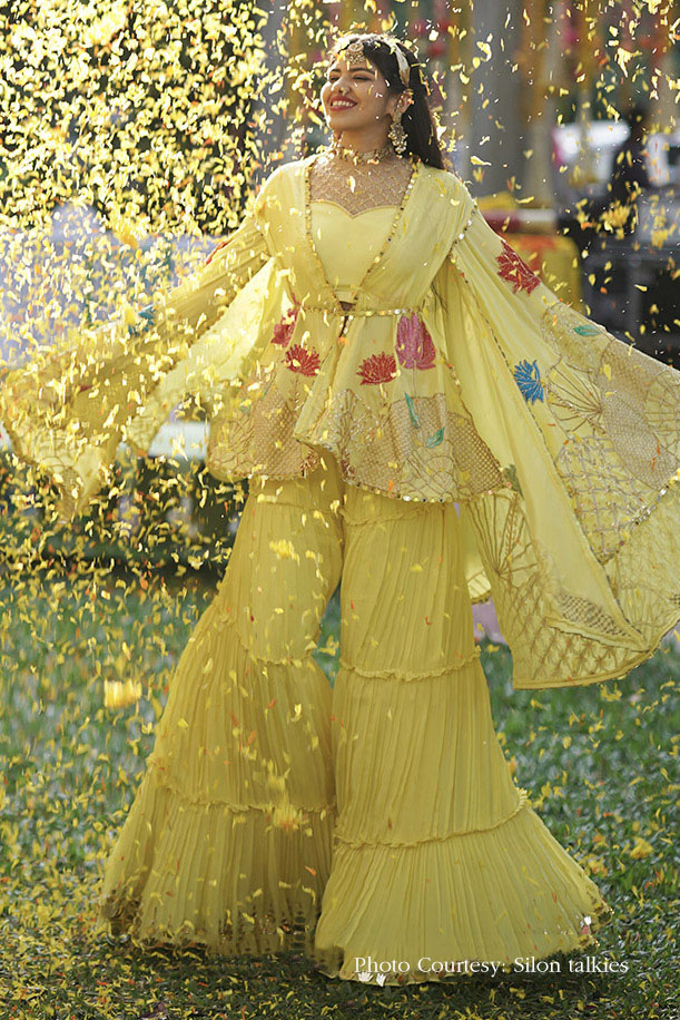 Drawing inspiration from the sunny yellow hue of Princess Belle’s outfit from the ‘Beauty and the Beast,’ the bride sported a lemon cape outfit with flare sleeves and pants embroidered in gold. She teamed her look with dangling pearl earrings and a matha patti. Her bright red lips matched the pops of red on her outfit.