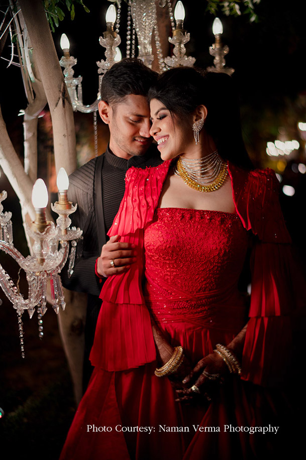 The sangeet function was themed on the royal love affair of Maharani Gayathri Devi and Man Singh II, for which the bride chose a ravishing red flared gown with self-toned embellishments and a ruffle layered bolero jacket. Her high ponytail and elegant diamond jewellery complemented her glamorous look.