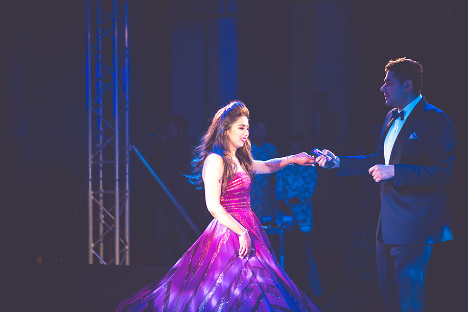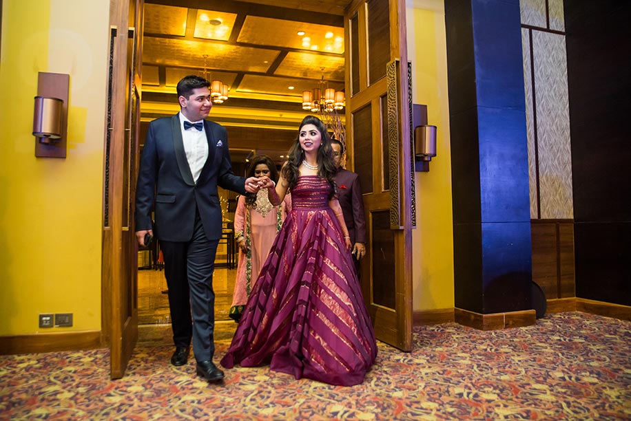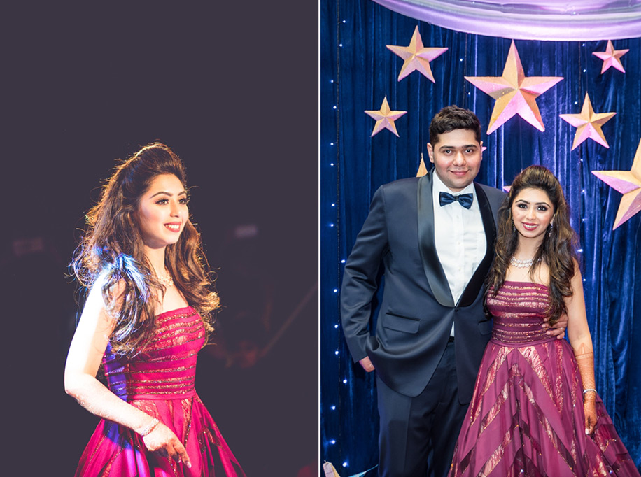 “For the sangeet, I wore an absolutely glamourous plum gown by Shantanu & Nikhil as I wanted to keep the look strictly red carpet-western for this event. I also loved the custom set by Zema Fine Jewellery that was understated yet detailed, and was made using strings of diamonds in different shapes. They even gave it a rose gold polish so that it matched with my outfit perfectly.”
