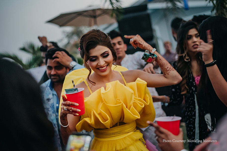 The wedding celebrations kicked off with the ring exchange ceremony, followed by the sangeet. Instead of the regular lehenga, Divya opted for a contemporary white and yellow gown by Dolly J Studio that featured striking patterns splashed across in dark grey. Her glittering jewelry and matte makeup completed her look for the evening.