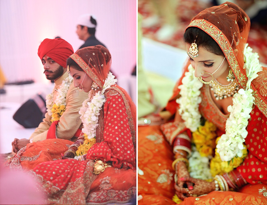 “Our wedding was a rather simple ceremony. It was held in a gurudwara and the pheras took place at the ambrosial period – also known as ‘Amrit vela’ – at 3 am. My wedding outfit was a full-floor length burnt orange brocade Anarkali lehenga with burnt orange two-layered net dupatta. I also draped a beautiful red Banarasi georgette dupatta with the ensemble. The outfit was my vision. From the time I learned that I would be having a gurudwara wedding, I was certain about how I wanted to look. Yet, my vision would not have materialized if it weren’t for my mother-in-law. She is a designer and amalgamated her expertise with my vision and created my wedding outfit. I wore the prettiest red ‘juttis’ by JuttiChoo. My bridal wedding set and ‘maang tikka’ were by Navrattan Jewellers, and my ‘nath’ (nose ring) was by Tarun Tahiliani.”