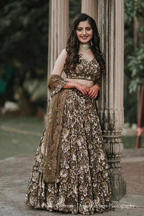 A Sangeet night calls for some glamour, and Gurpreet decided to dazzle in a spectacular bronze grey lehenga by Seema Gujral. Extravagantly detailed with gold sequin flowers, the lehenga was teamed with an embroidered net dupatta. A riveting Minakari set with pearl and polki detailing adorned her neck and ears, while soft curls, bronze eyelids, beautifully curled lashes and wine lips completed her look.