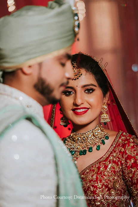 Looking every bit the quintessential Indian bride, Gurpreet kept it traditional for the wedding in a richly embroidered red and gold lehenga from Bindani by Megha and Jigar teamed with a statement polki jewelry set studded with green and pink semi-precious stones. She opted for a royal 2-dupatta styling and wore gold kaleere on her hands. Her hair was set in an elegant bun which was accessorized with fresh flowers, and she kept her makeup simple yet stunning with a fresh face, smokey eyes, and red lips. Finally, she complimented her look with sequined gold juttis that further added to her splendor.
