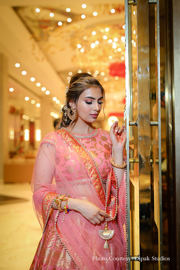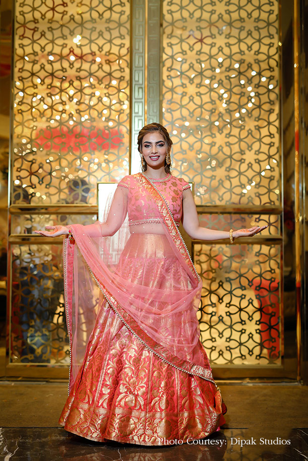 “Going with the traditional mood of this function, I chose an ombre Banarasi lehenga with orange and peach shades. As for the makeup, the idea was to let the look be very fresh and in sync with the shades of my attire. Therefore, I created a soft, romantic look for myself using peach eyeshadow and muted pink lips.”