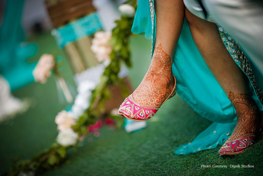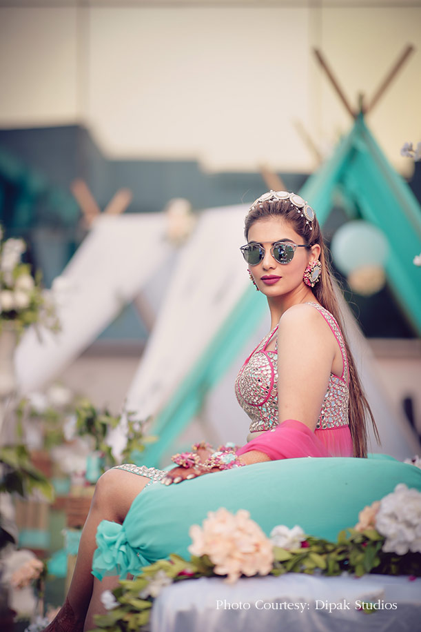 “For my mehndi, I wanted to wear something unique that I could cherish forever. Since the theme for the function was ‘An Evening in Greece’ with the decor in blue and white, I thought of going with an Indo-Western creation by Roli Maheshwari. I opted for a turquoise skirt and paired with a hot pink top covered in mirror work. Not only did it look great, but it was also very easy to carry! I completed the look with mirror jewellery and added a pretty hairband to the mix. Since my ensemble was so striking, I decided to let my makeup be natural with flawless skin, classic eyeliner and pink lips that did the trick.”