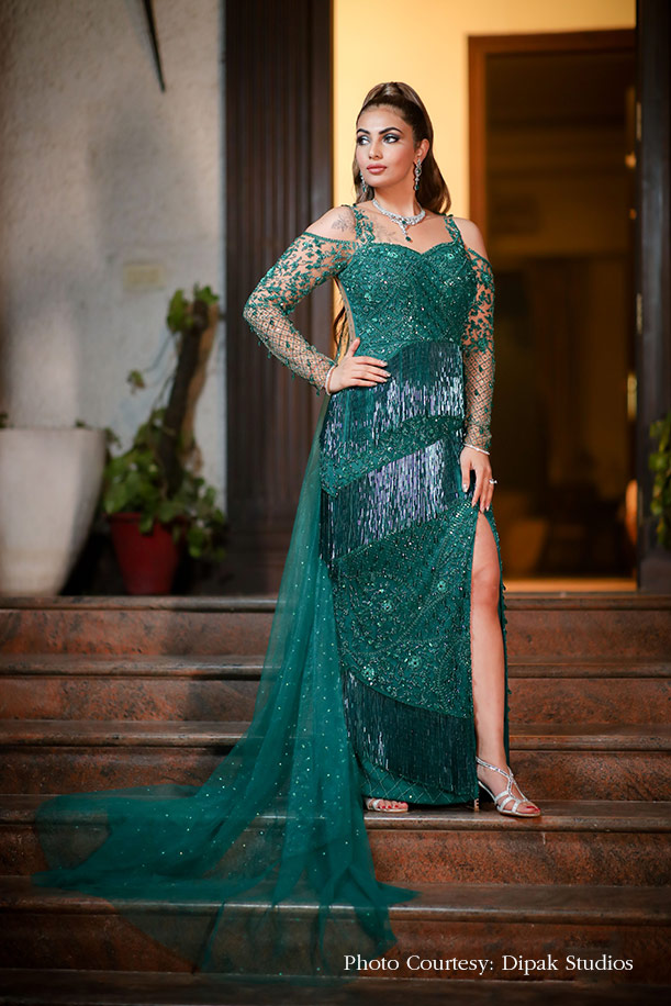 “This was a glittering night for which I wanted something that would make a statement so I opted for a bottle green gown by Roli Maheshwari Cocktail & Couture. The fabric was embellished with sparkling sequins and beads, and it even had a trail. This outfit was dramatic, yet delicate and reminded me of a modern-day Cinderella story! Smokey eyes with nude lips and a distinctive natural glow was my beauty look for this event. Classic and sexy, the look was perfect for a cocktail night!”