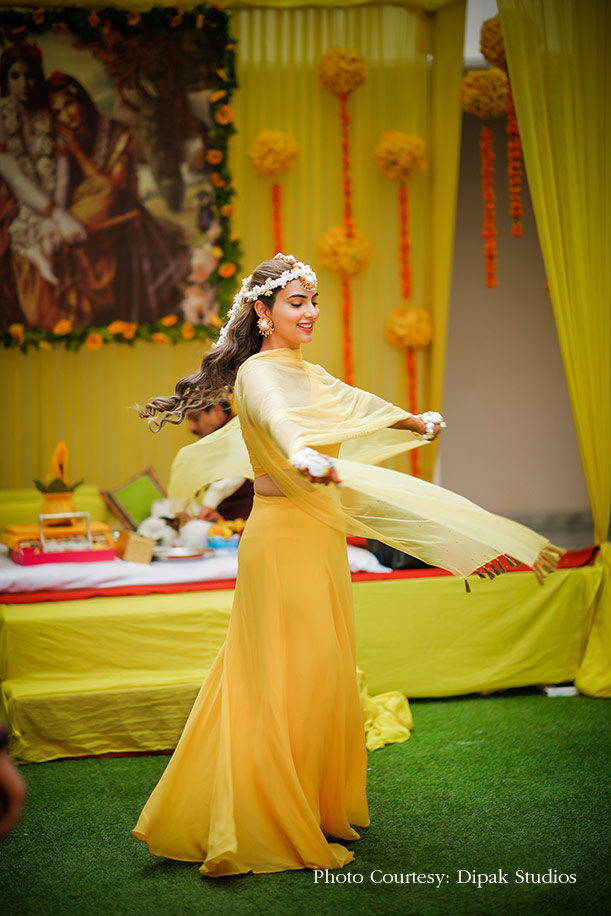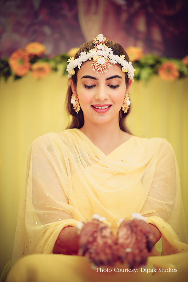 “I picked a simple, bright yellow lehenga for my haldi and paired it with floral jewellery with golden accents. My makeup was very minimal and comprised only of mascara and lipstick.”