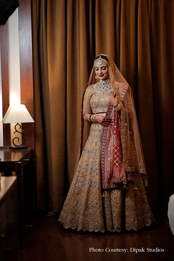 “I wanted to steer away from the usual reds and pinks that most brides opt for on my wedding day and I fell in love with a beautiful peach lehenga with intricate work. I paired this with a beautiful red and gold Banarasi dupatta, and the ensemble looked regal! As a makeup artist, I believe that every bride should enhance her features on her big day instead of hiding them under gaudy, unflattering makeup. Once again, I created my look since I knew exactly what I wanted. I gave myself a soft bronze smokey eye and balanced it with a deep red pout and glowing skin.