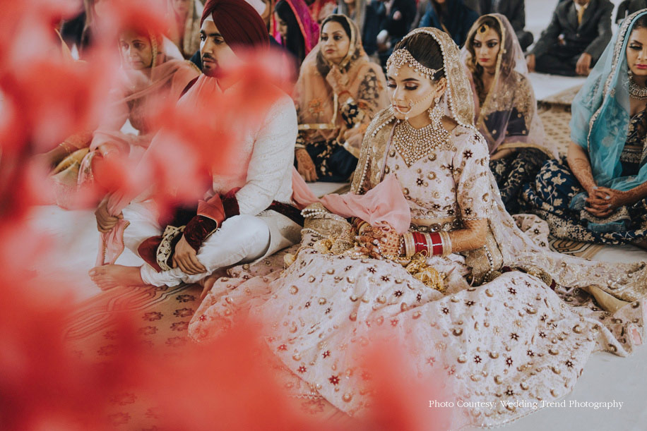 “The sangeet was a grand pastel-themed event, and I wore a yellow lehenga with mirror work on the skirt and a Disney princess-like blouse. This was paired with a peach cape dupatta that doubled up as the necklace and was inspired by Sonam Kapoor’s look in ‘Veere Di Wedding.’ An interesting element in this outfit was the latkan (dangling tassel) which had details that spelled “Gunjeet Weds Karina.” This is was something that made this ensemble very special to me. My makeup was done by Mannat Gill. I was very particular about having minimal makeup on all three days because I wanted to look as natural as possible. Therefore for this event, we went with glossy peach lips alongside soft brown and gold eyelids.”