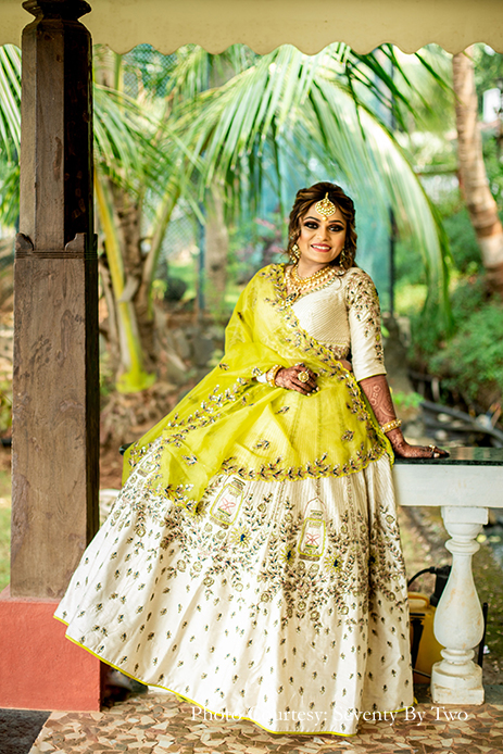 A bright and colorful affair, the Mamera ceremony was made even brighter with the bride’s white and lemon yellow lehenga. Replete with floral embroidery on the skirt and sleeves, this outfit was perfect for the breezy event. The light outfit was teamed with statement jewelry as the bride chose to wear an elaborate maang tikka with a meenakari necklace. On the makeup front, Khushboo chose to go for a versatile gold smoky eye look and a subtle pink pout.