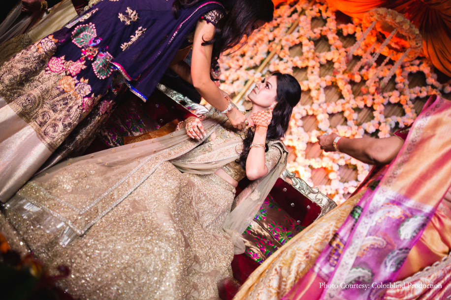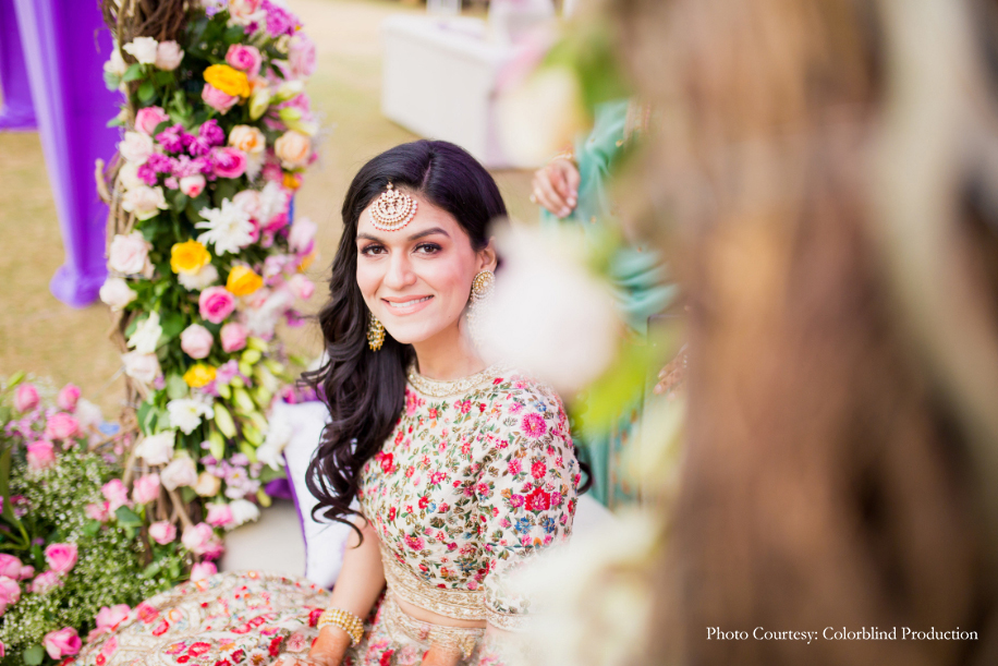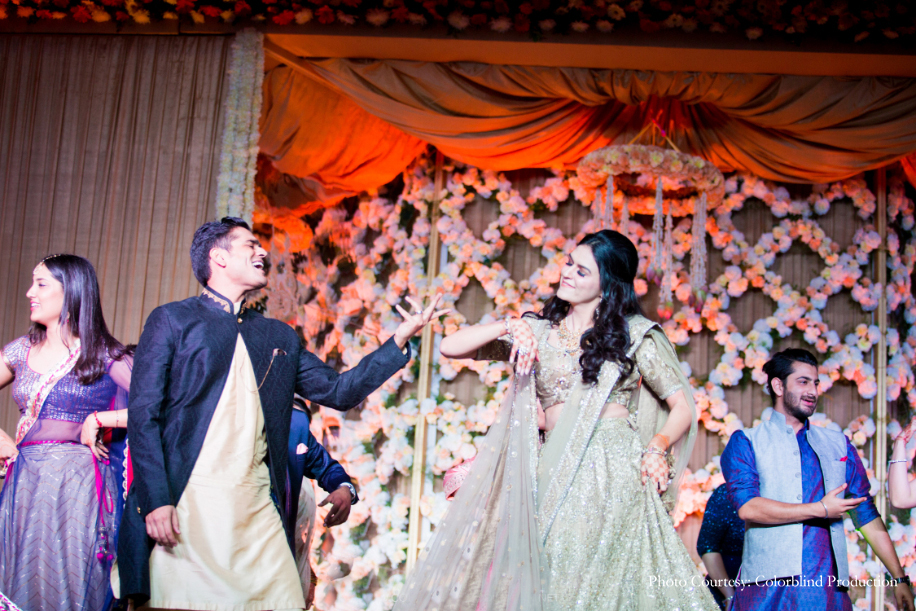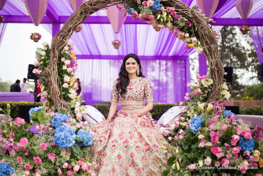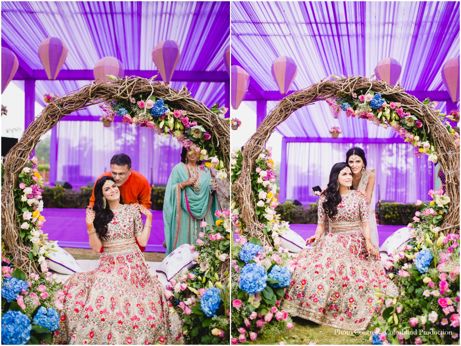 With pretty flowers in every shape and size as the decor highlight of this function, the mehndi ceremony was resplendent with gorgeous elements. Misha looked beautiful in her dazzling lehenga which featured red and pink floral embroidery all over. With purple and blue being the color highlights of the decor, the unconventional ideas and creativity this bride exhibited was impressive.