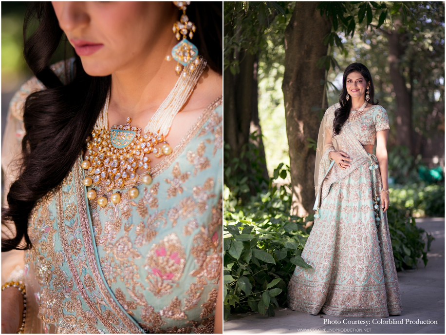 The beautiful color palette of pastels created an ethereal and romantic feel at Misha’s reception. An assortment of lanterns and tea lights filled the venue and the whimsical floral patterns packed a punch. The bride wore a light teal lehenga with intricate embroidery and gorgeous jewellery for this event.