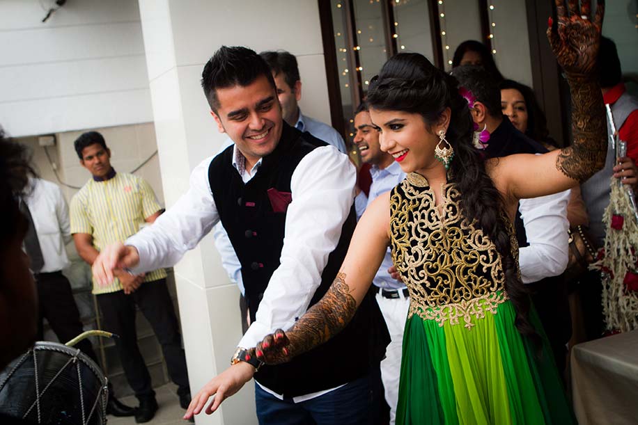For the mehndi function, Priya wore a long green and antique gold anarkali suit by designer Dinesh Malkani and chaand baalis to match while Satyajit donned a bandhgala from Aza.