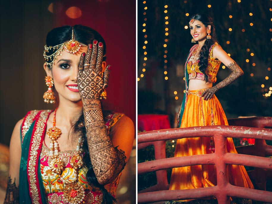 I wanted a very vibrant and colourful look for my mehndi ceremony. So I picked a beautiful deep yellow Banarsi silk lehnga by Bhumika Grover, which was paired with a floral blouse and deep green dupatta. Bhumika was a delight to work with and designed outfits for the rest of my family too. The entire look really came together with gorgeous gota patti jewellery by ‘Fooljhadi’ who was a wonderful find on Instagram.