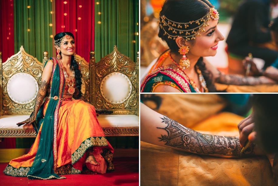 Mehndi: I put together a ‘green garden’ theme for the mehndi ceremony. My cousin Ishita Ladha did a splendid job in designing all of the men’s outfits with coordinating jackets and kurtas. The ladies also wore green outfits with matching gota patti rings and maang tikkas from ‘Titli by Aayushi’. I was keen to include my adorable niece and nephew in the event, as well as add my own personal touch. So I designed a ‘Here Come The Bride’ board for them to hold when I entered the venue. It was super cute!